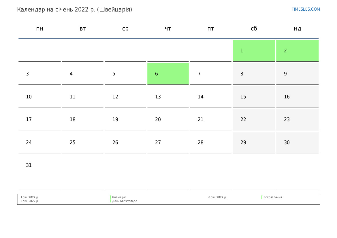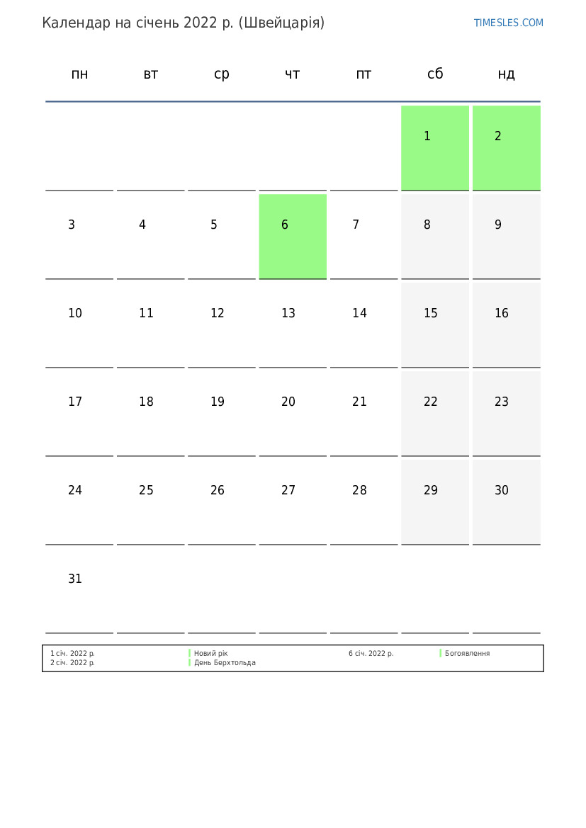 Календар свят та вихідних на січень 2022 року для Швейцарії