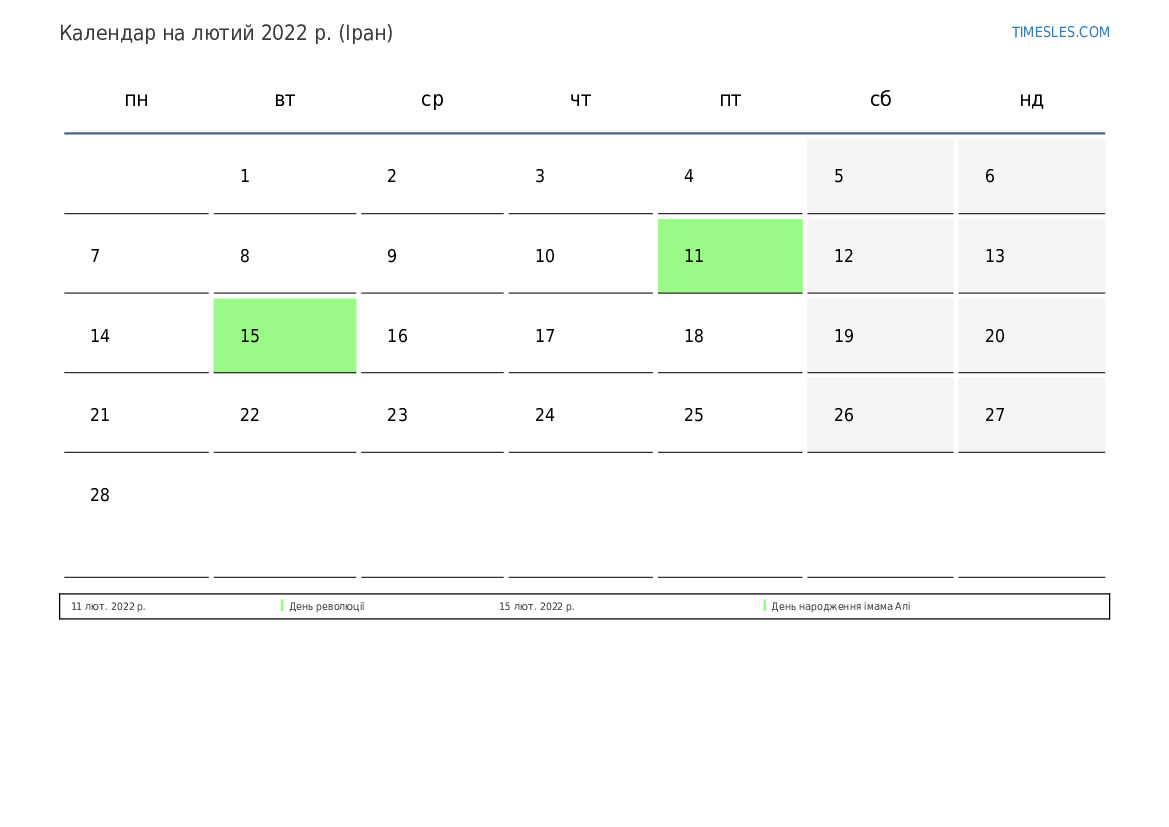 Календар свят та вихідних на лютий 2022 року для Ірану