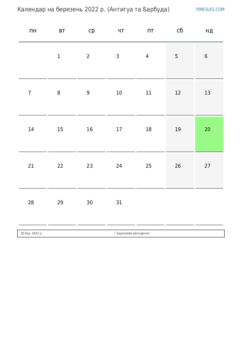 Календар на березень 2022 року для Антигуа та Барбуди