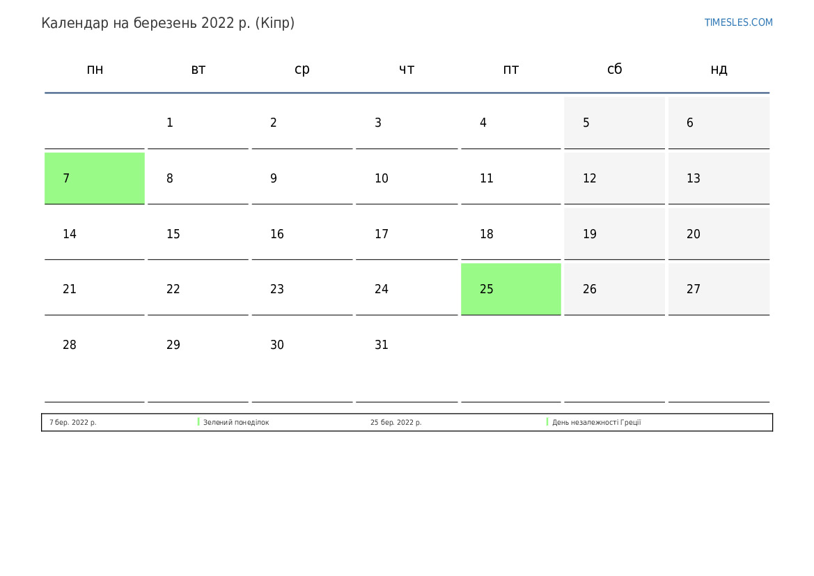 Календар свят та вихідних на березень 2022 року для Кіпру