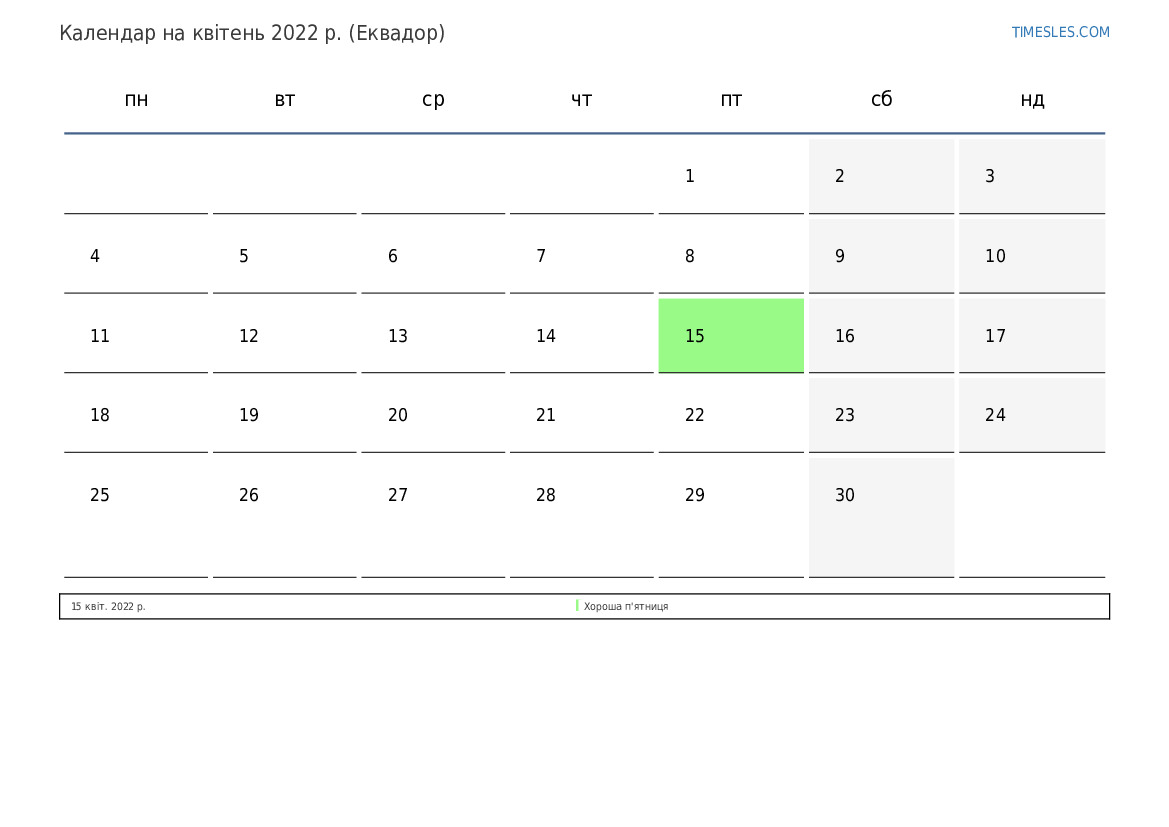 Календар свят та вихідних на квітень 2022 року для Еквадору