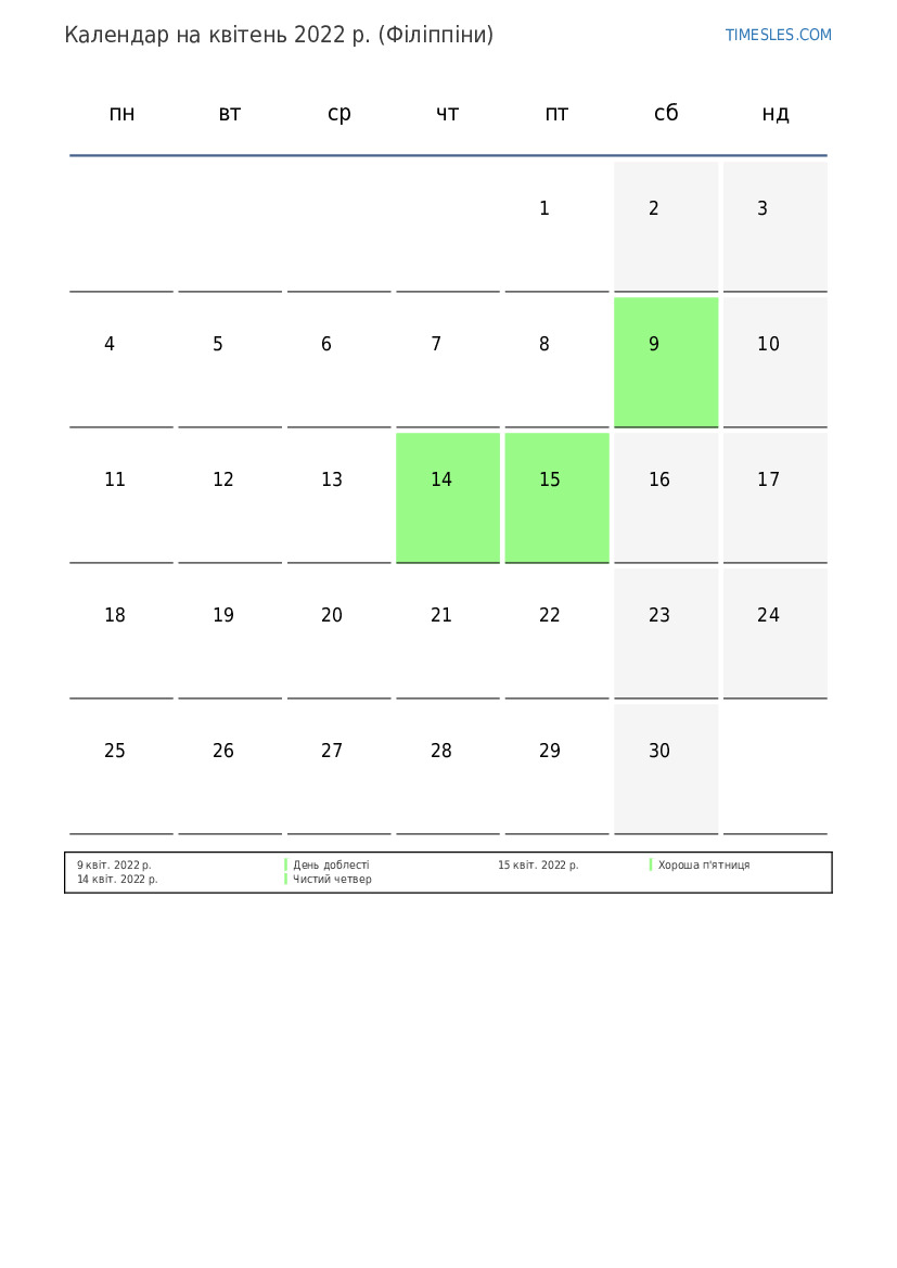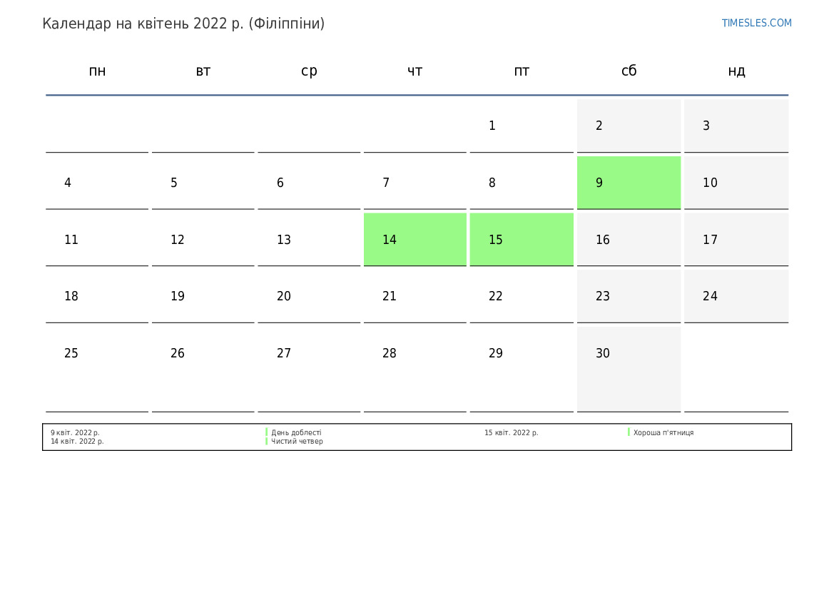 Завантажте та роздрукуйте календар PDF зі святами та вихідними на квітень 2022 року для Філіппін