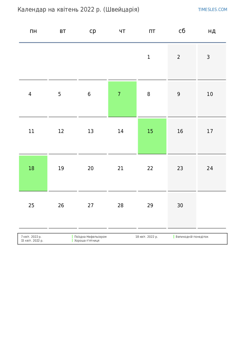 Календар свят та вихідних на квітень 2022 року для Швейцарії