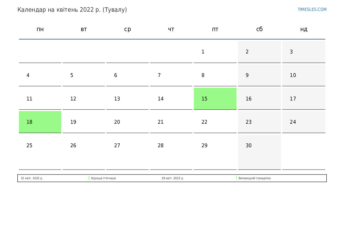 Завантажте та роздрукуйте календар PDF зі святами та вихідними на квітень 2022 року для Тувалу