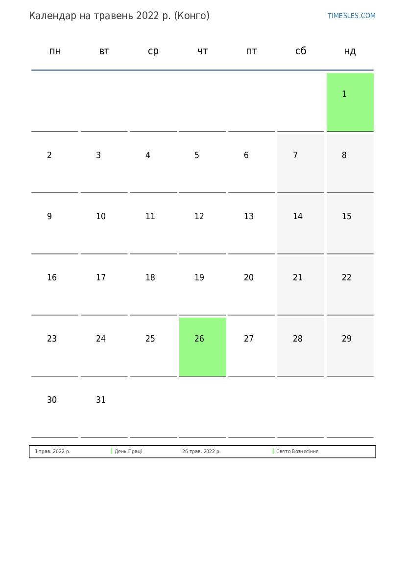 Календар на травень 2022 року для Конго