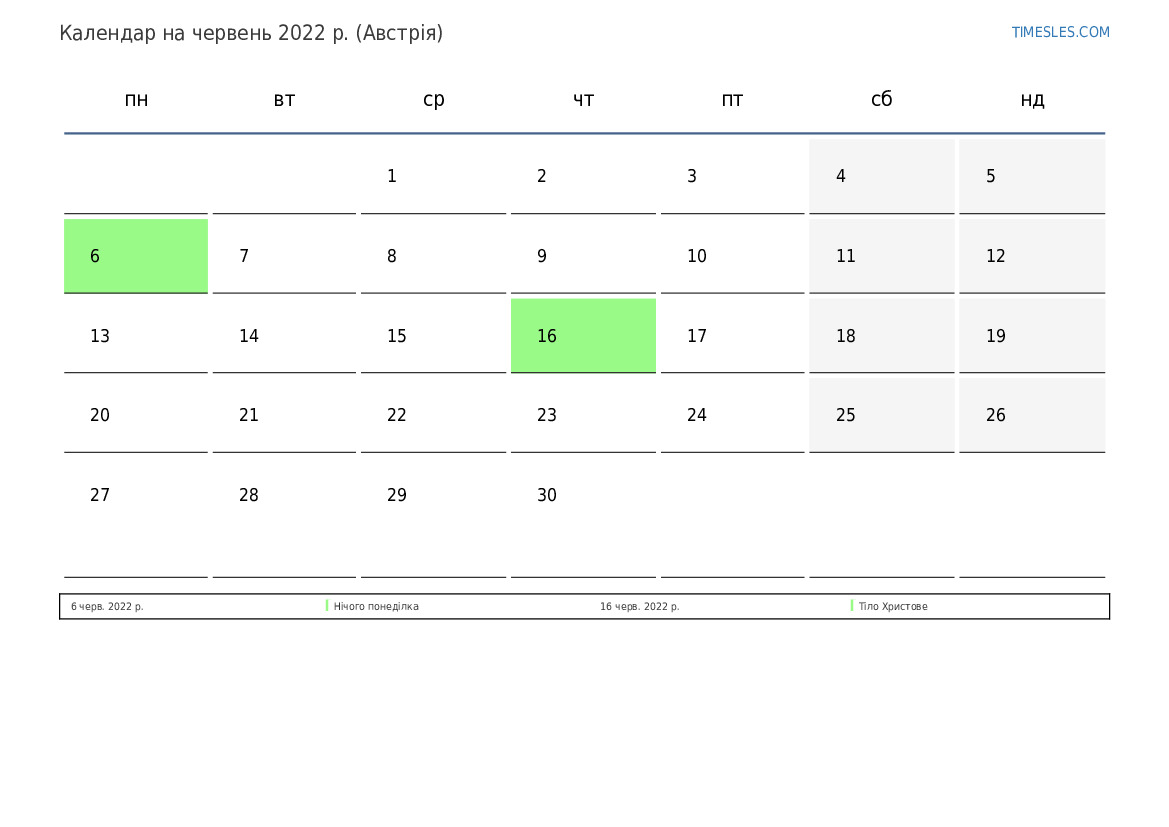Завантажте та роздрукуйте календар PDF зі святами та вихідними на червень 2022 року для Австрії