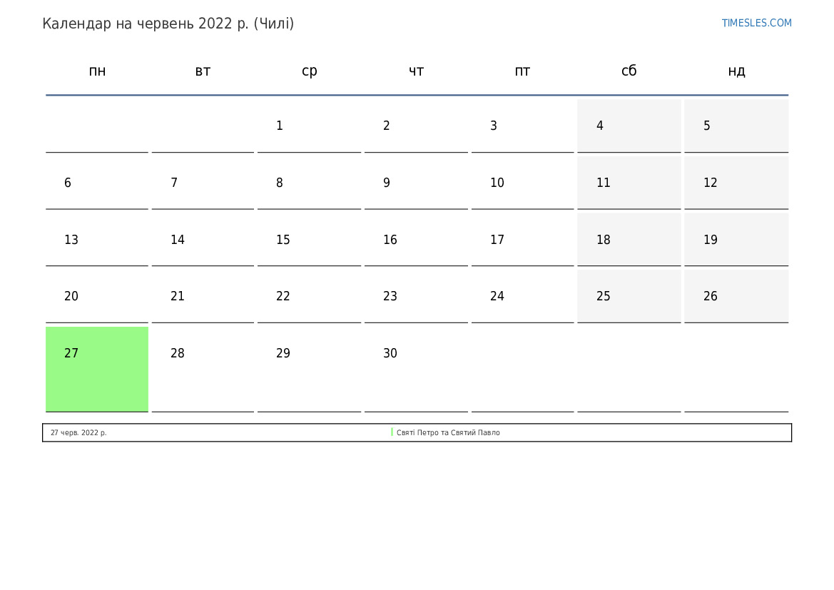 червень містить 30 днів. Це 6 місяць 2022 року. Сезон року: літо. червень починається в середу і закінчується у четвер. У січні 2022 року в Чилі 3 свят та вихідні.
