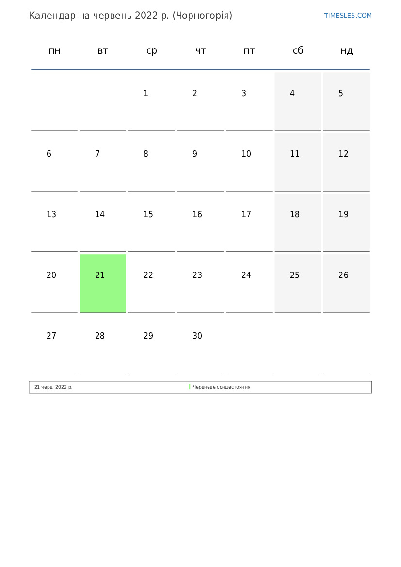 Завантажте та роздрукуйте календар PDF зі святами та вихідними на червень 2022 року для Чорногорії