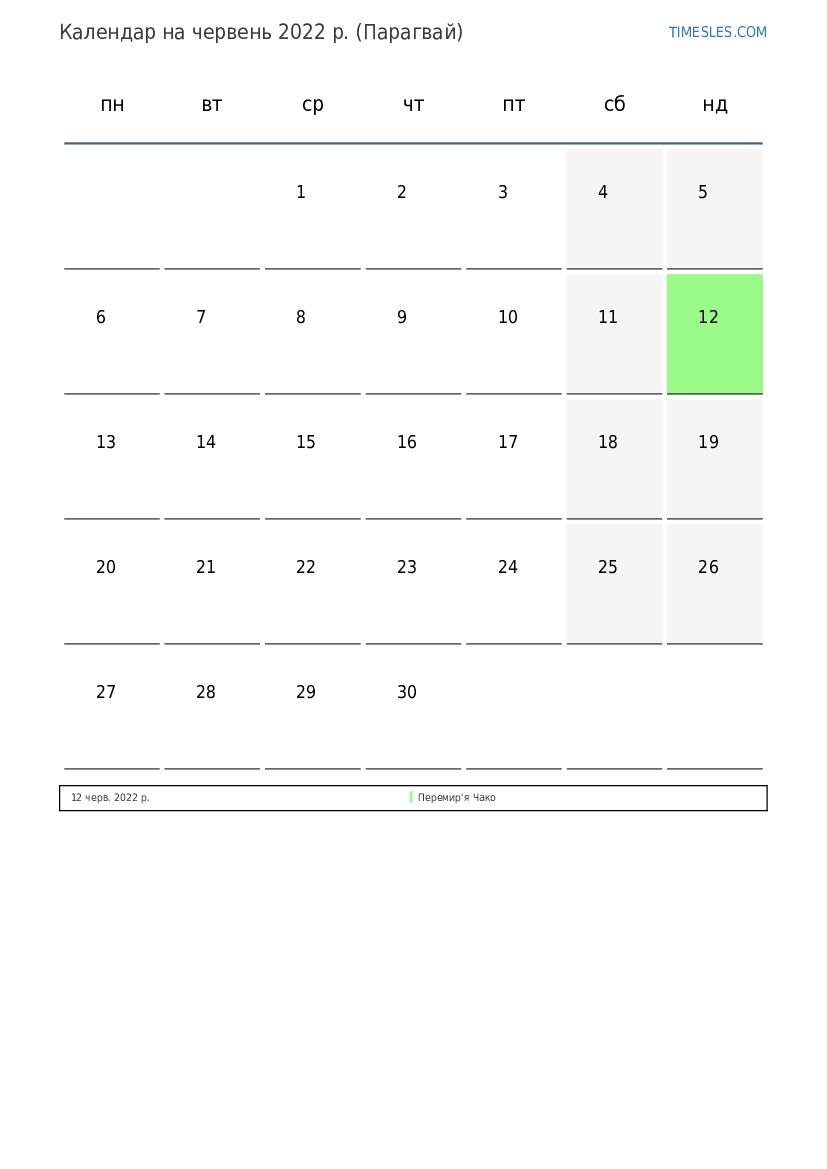Календар свят та вихідних на червень 2022 року для Парагваю