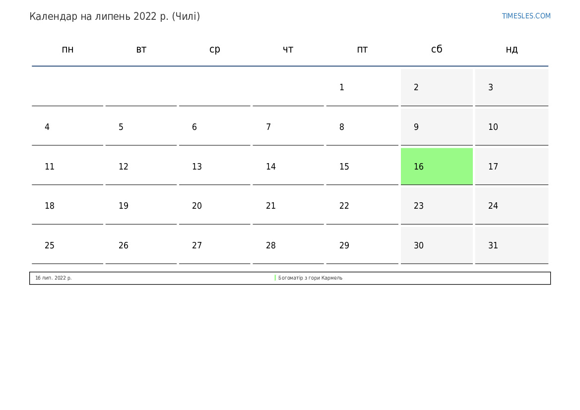 Завантажте та роздрукуйте календар PDF зі святами та вихідними на липень 2022 року для Чилі