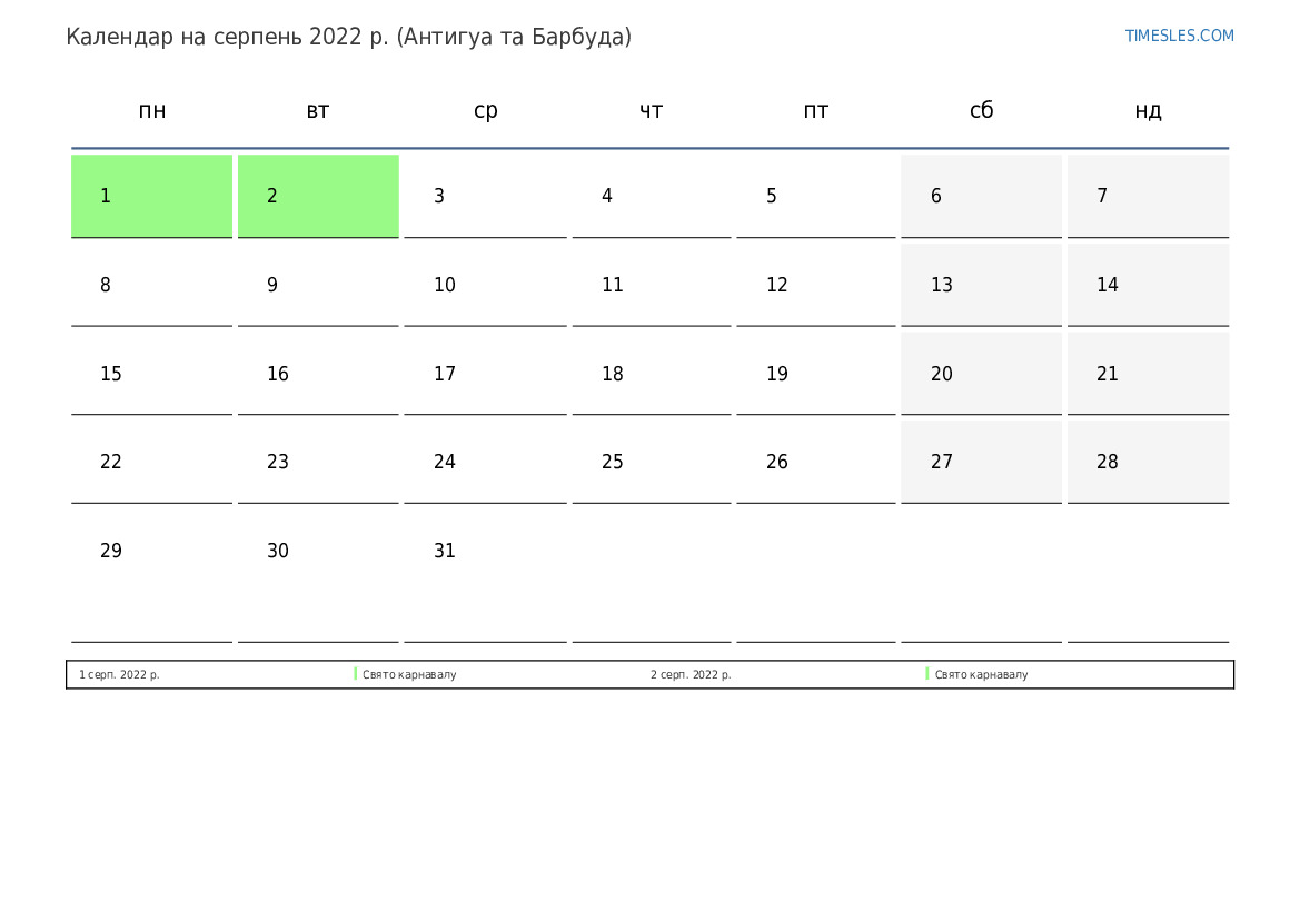 Календар на серпень 2022 року для Антигуа та Барбуди