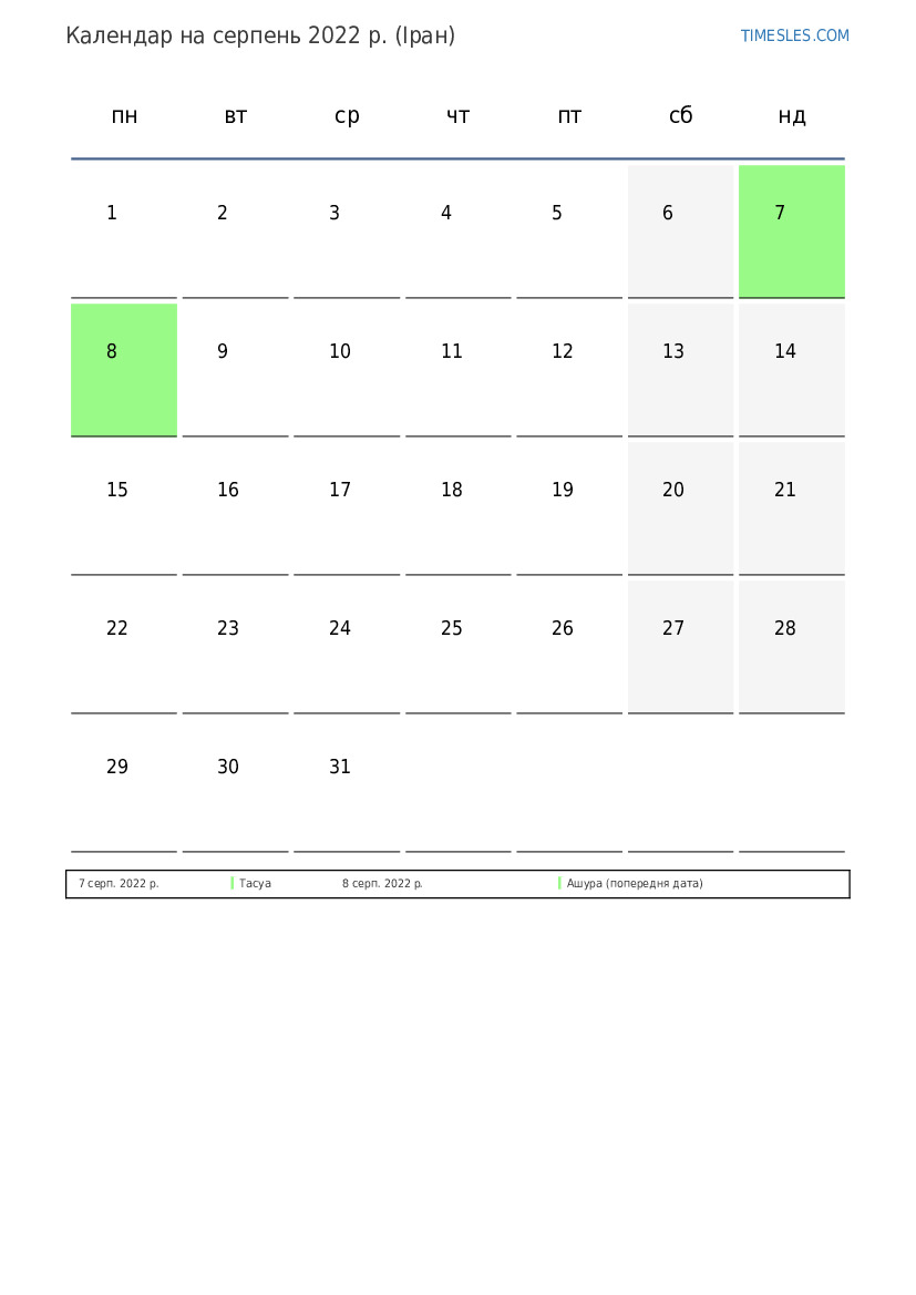 Календар на серпень 2022 року для Ірану