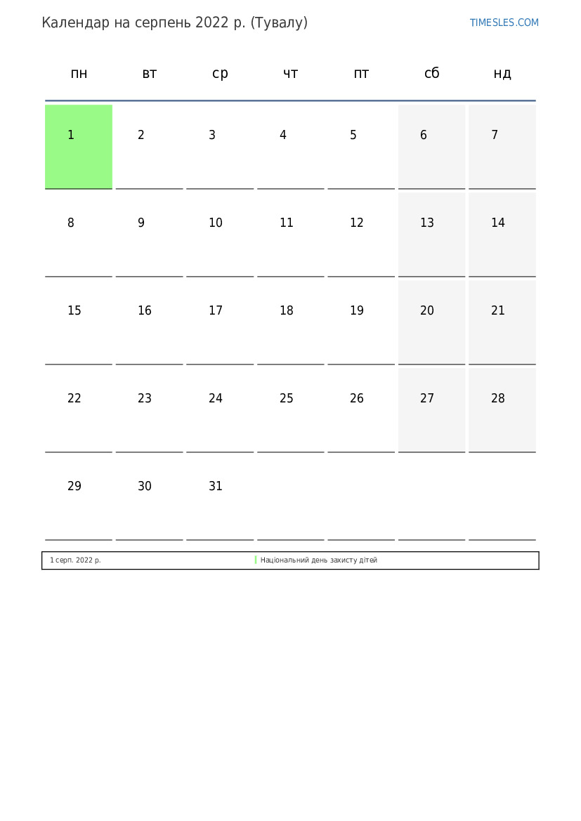 Завантажте та роздрукуйте календар PDF зі святами та вихідними на серпень 2022 року для Тувалу