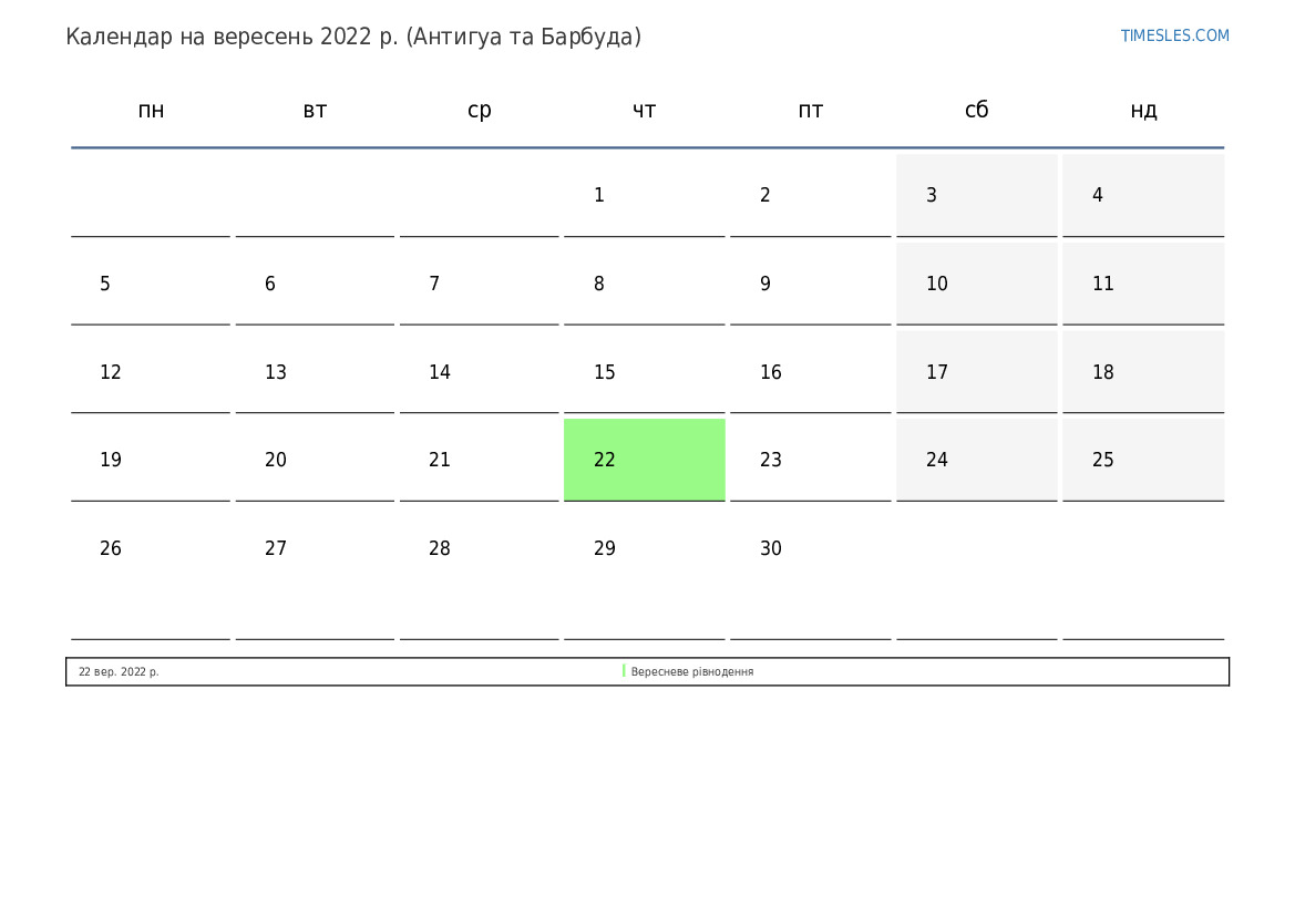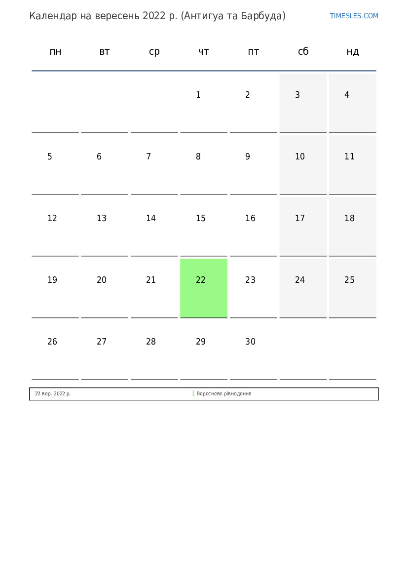Календар на вересень 2022 року для Антигуа та Барбуди
