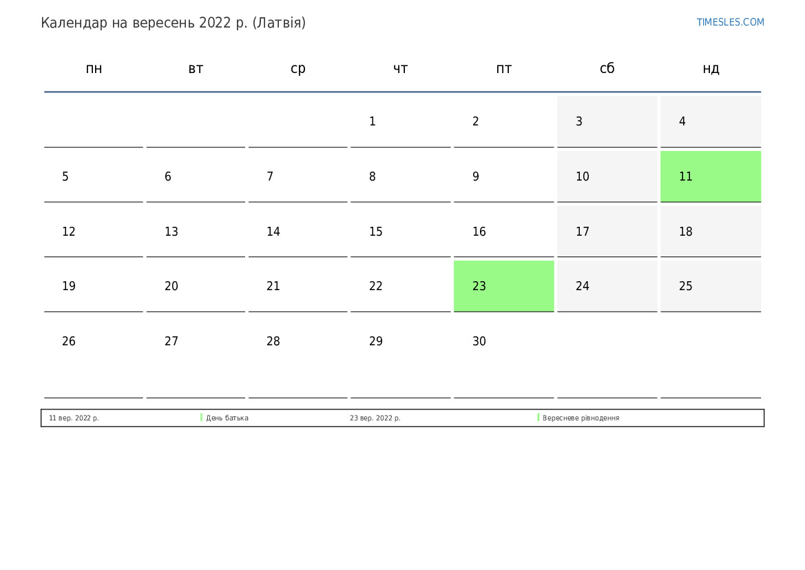 Завантажте та роздрукуйте календар PDF зі святами та вихідними на вересень 2022 року для Латвії