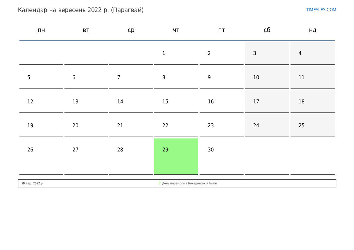Календар свят та вихідних на вересень 2022 року для Парагваю