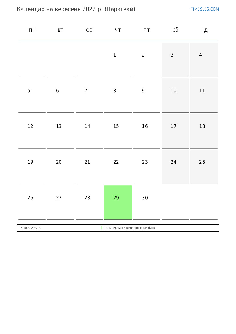 Завантажте та роздрукуйте календар PDF зі святами та вихідними на вересень 2022 року для Парагваю