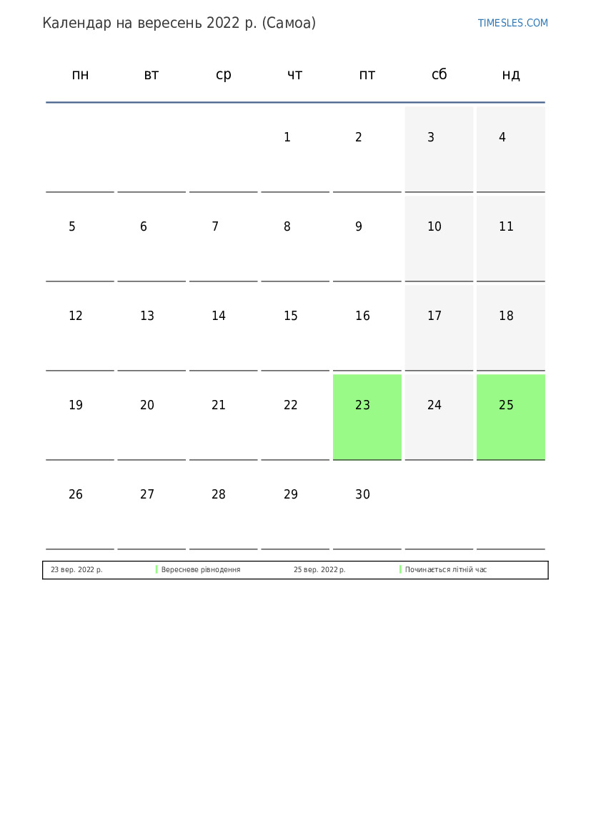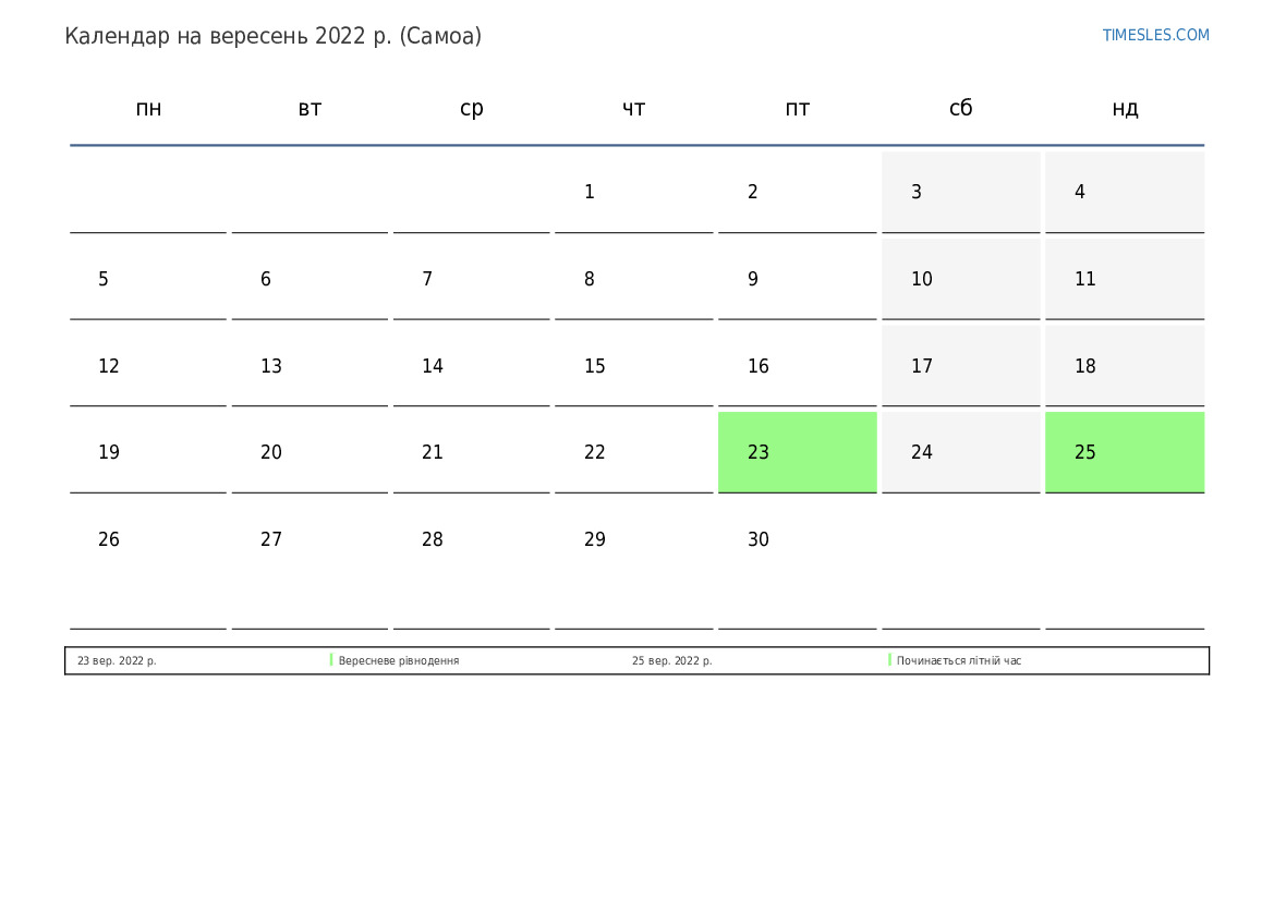 Завантажте та роздрукуйте календар PDF зі святами та вихідними на вересень 2022 року для Самоа