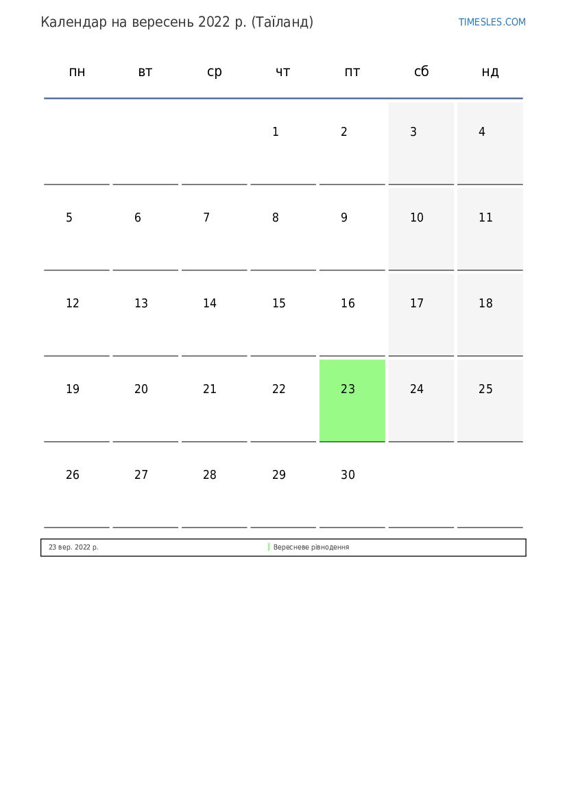 Завантажте та роздрукуйте календар PDF зі святами та вихідними на вересень 2022 року для Таїланду