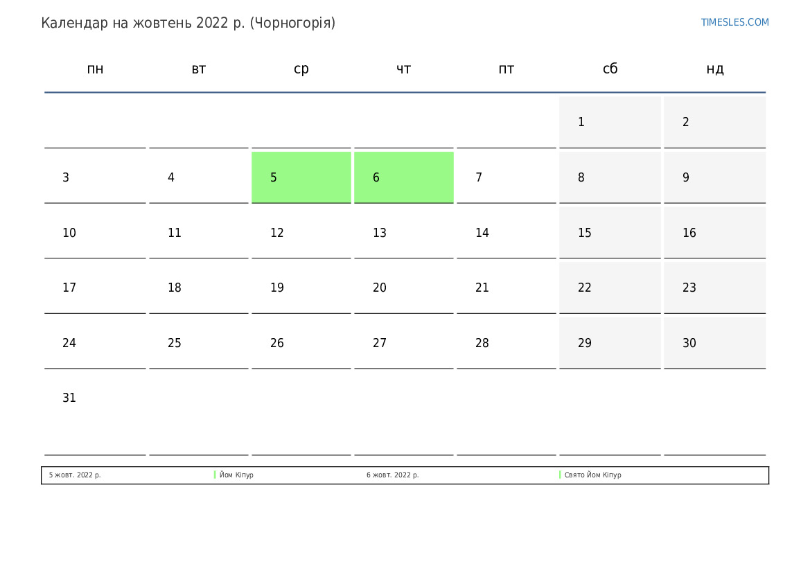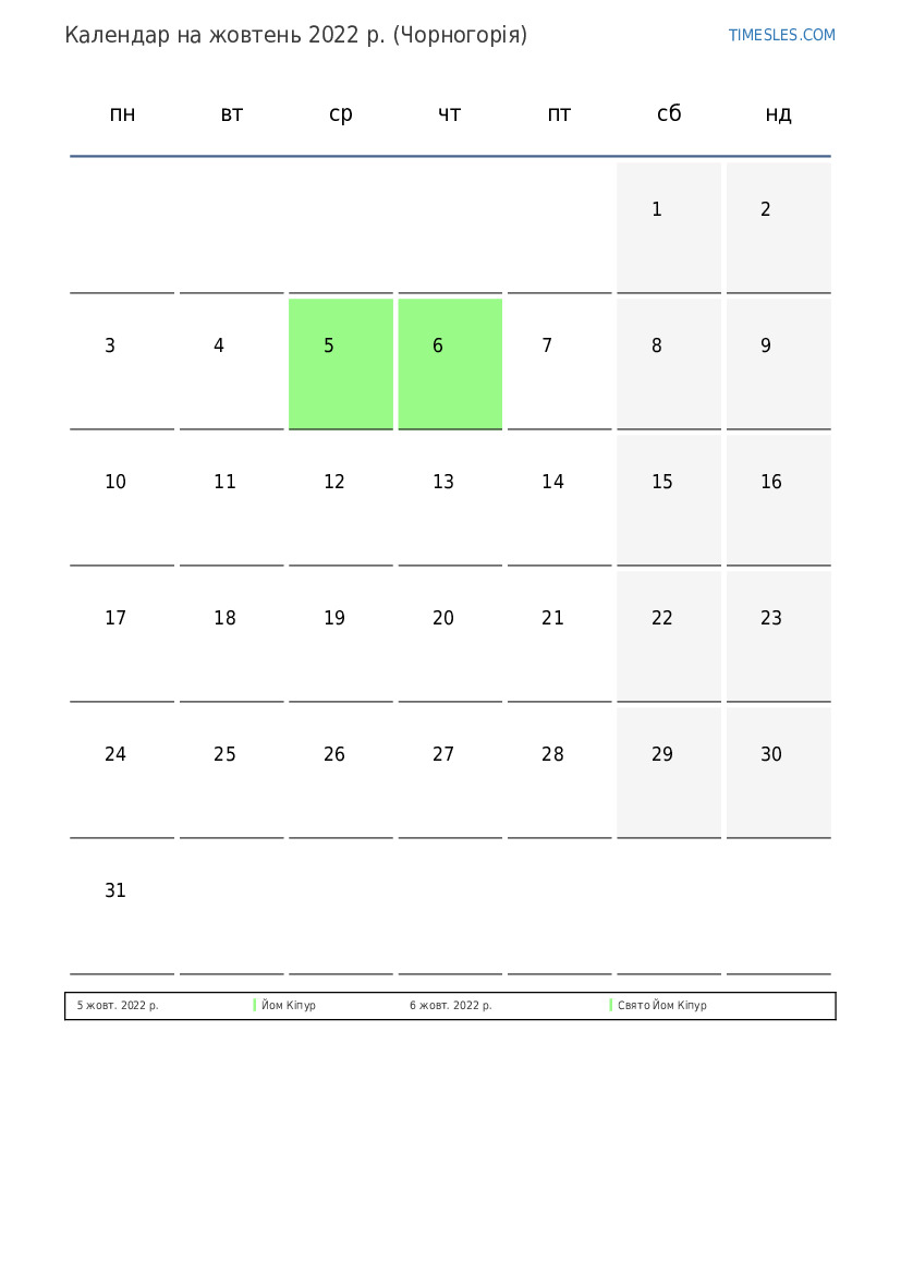 Календар свят та вихідних на жовтень 2022 року для Чорногорії