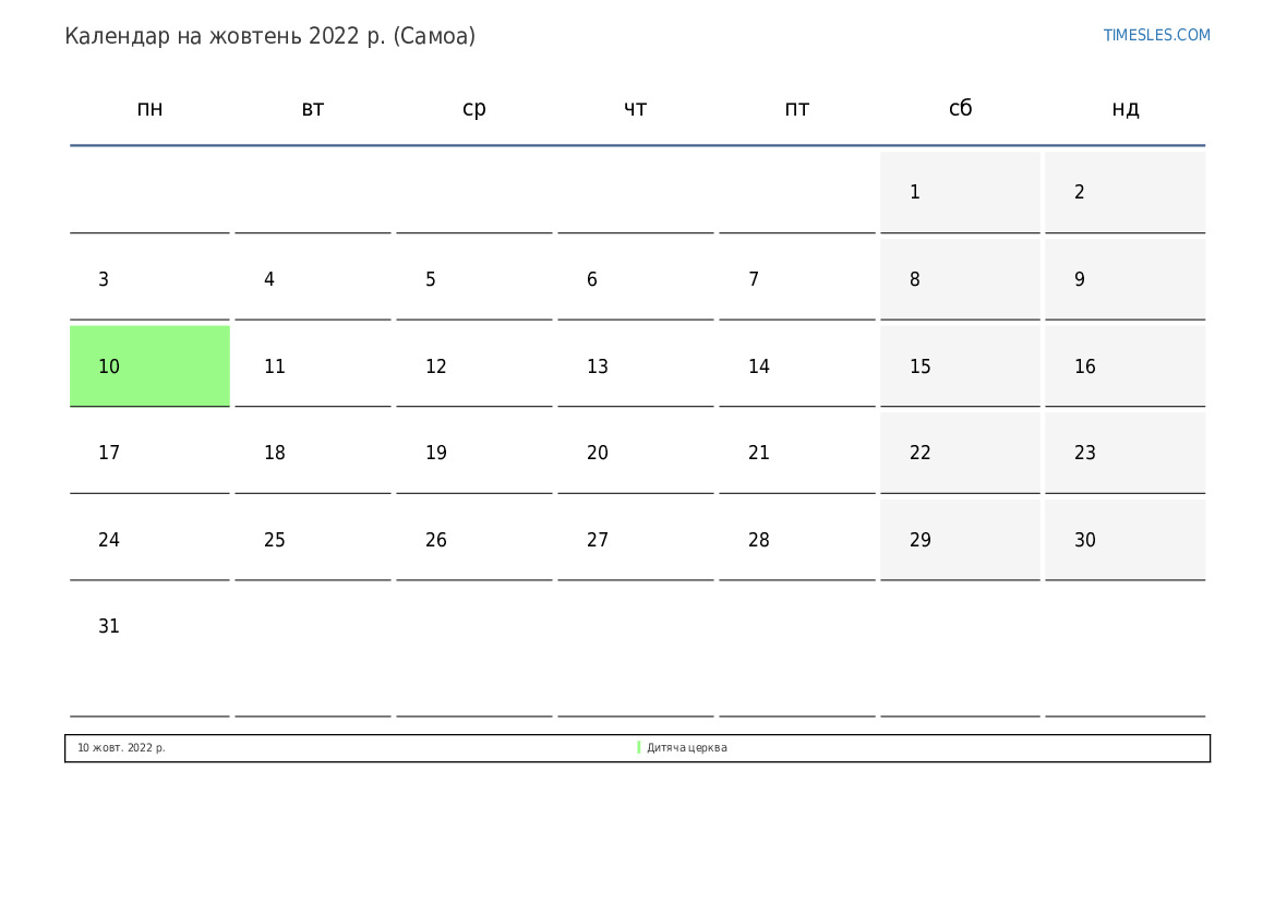 Завантажте та роздрукуйте календар PDF зі святами та вихідними на жовтень 2022 року для Самоа
