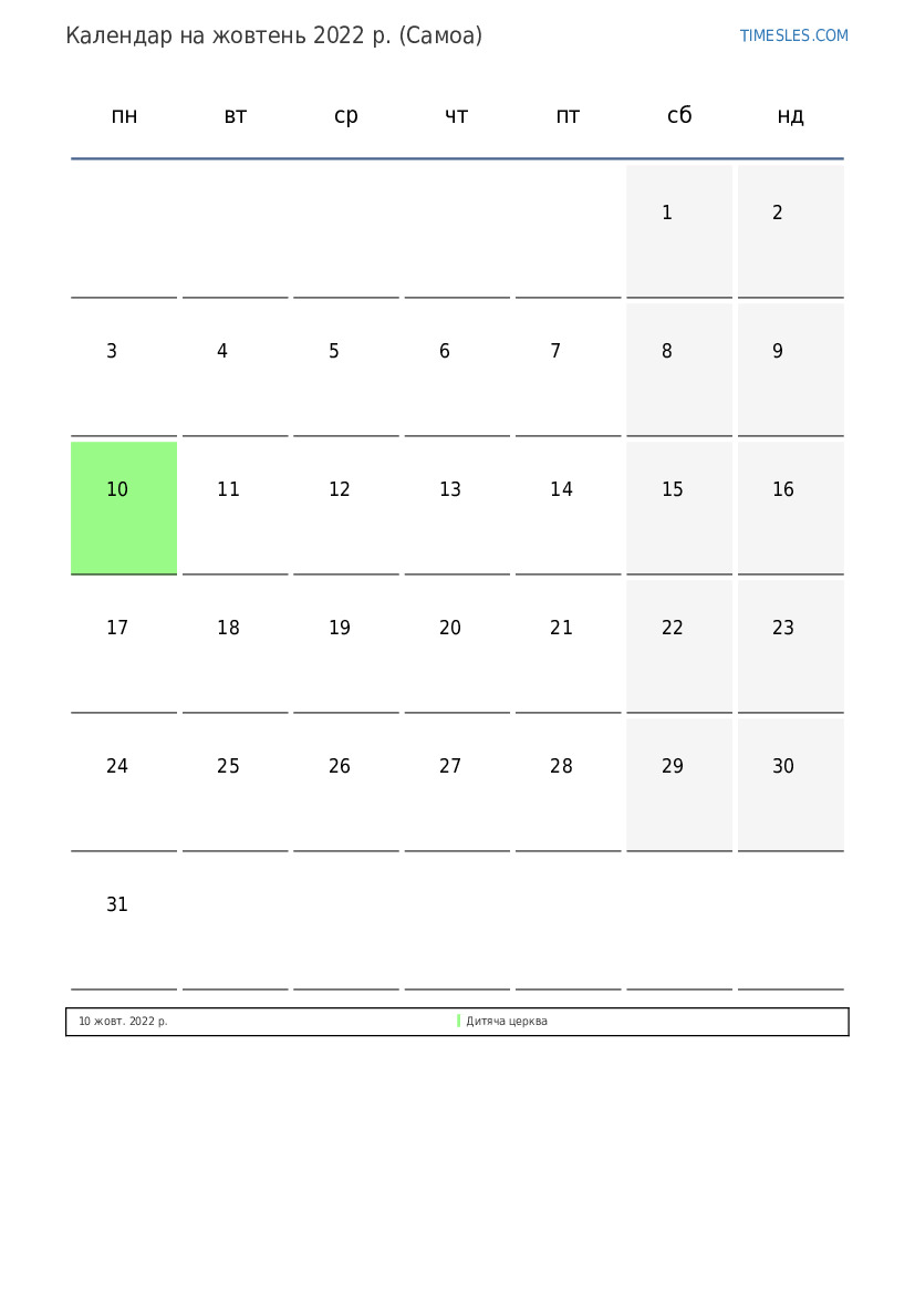 Календар свят та вихідних на жовтень 2022 року для Самоа
