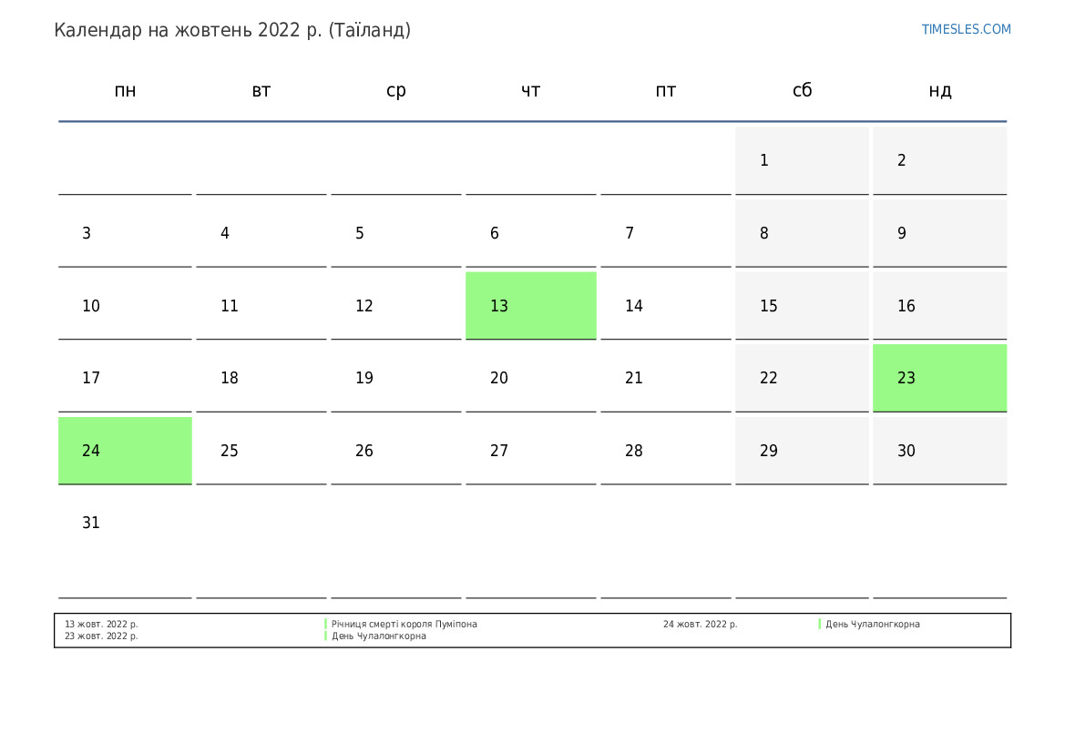 Календар на жовтень 2022 року для Таїланду