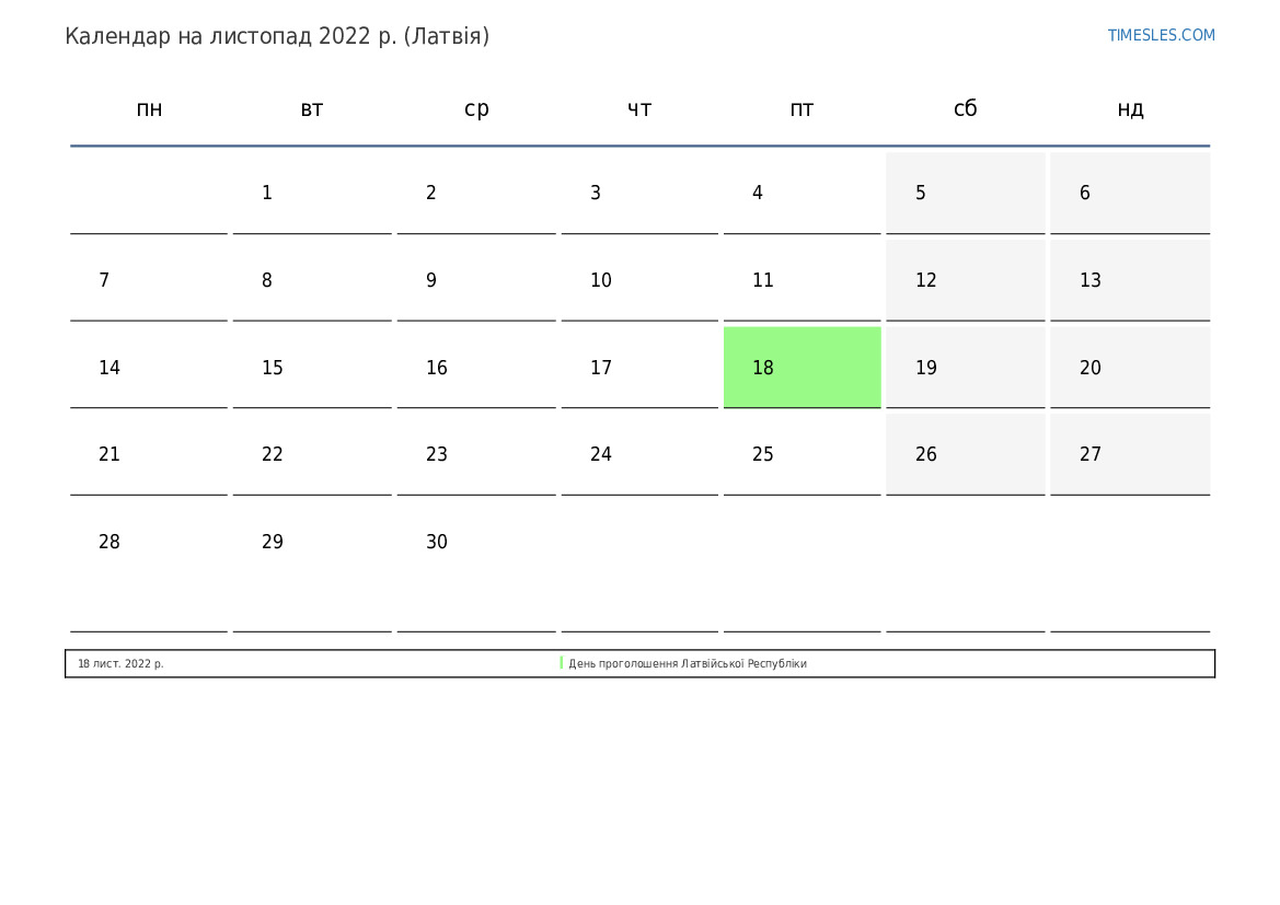 Завантажте та роздрукуйте календар PDF зі святами та вихідними на листопад 2022 року для Латвії