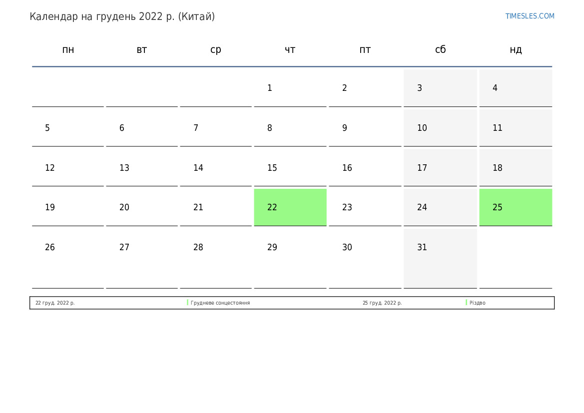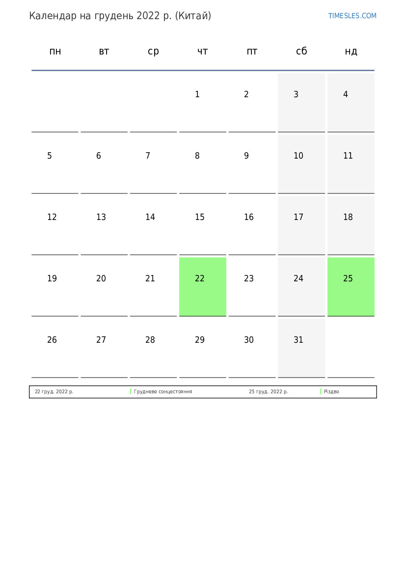 Завантажте та роздрукуйте календар PDF зі святами та вихідними на грудень 2022 року для Китаю