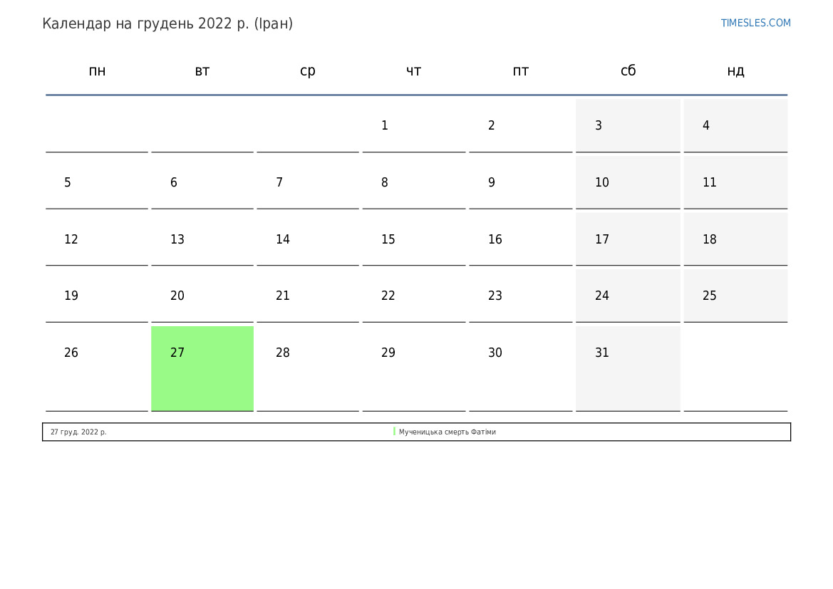Календар свят та вихідних на грудень 2022 року для Ірану