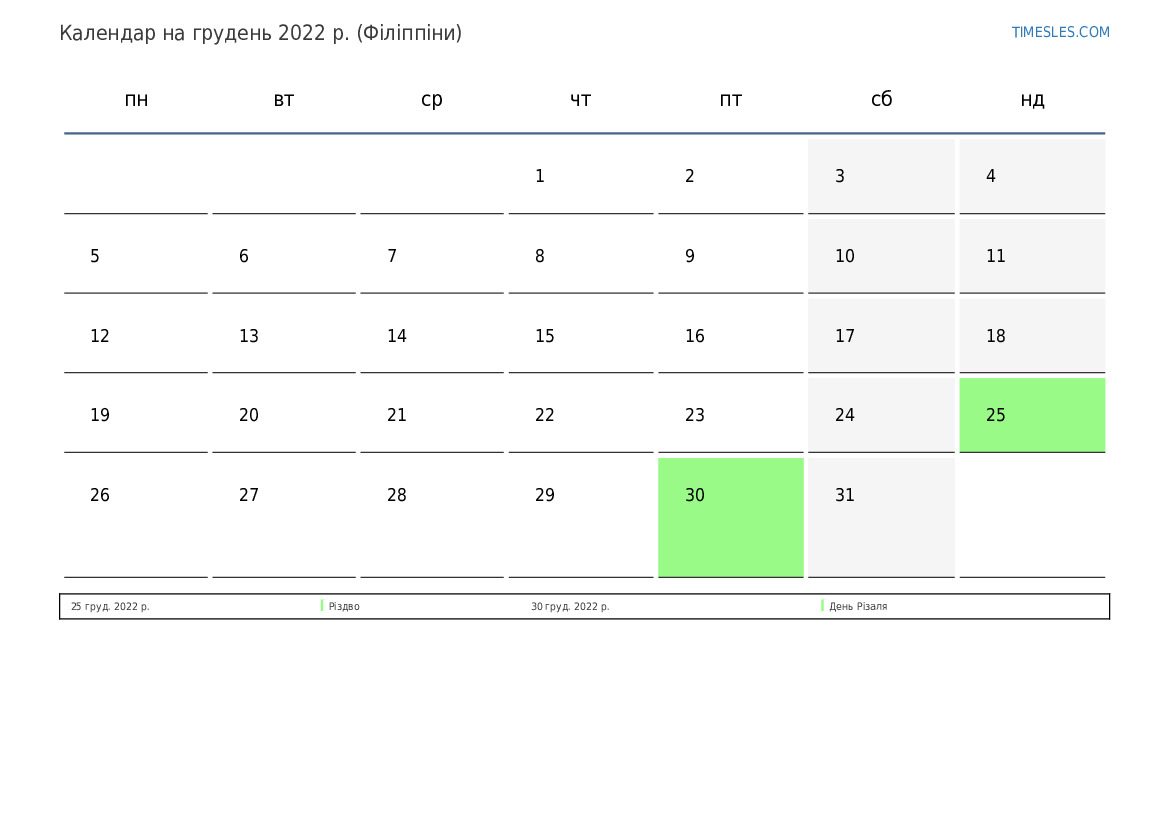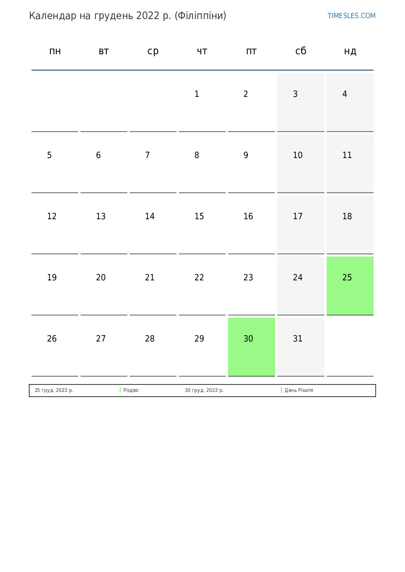 Завантажте та роздрукуйте календар PDF зі святами та вихідними на грудень 2022 року для Філіппін