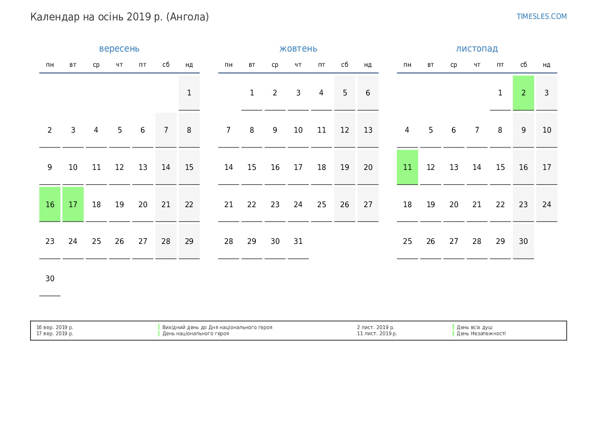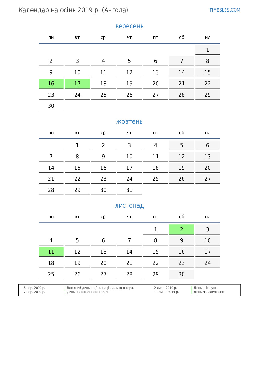 Завантажте та роздрукуйте календар PDF зі святами та вихідними на осінь 2019 року для Анголи