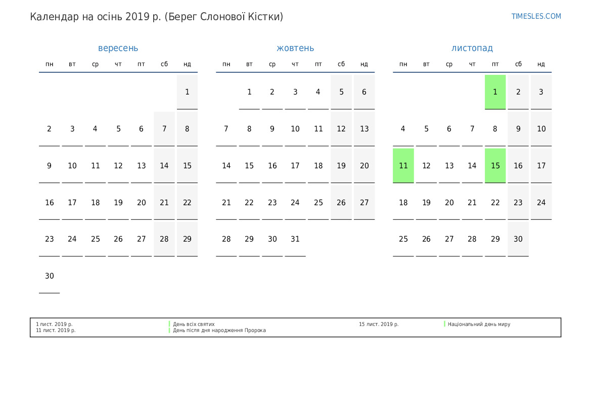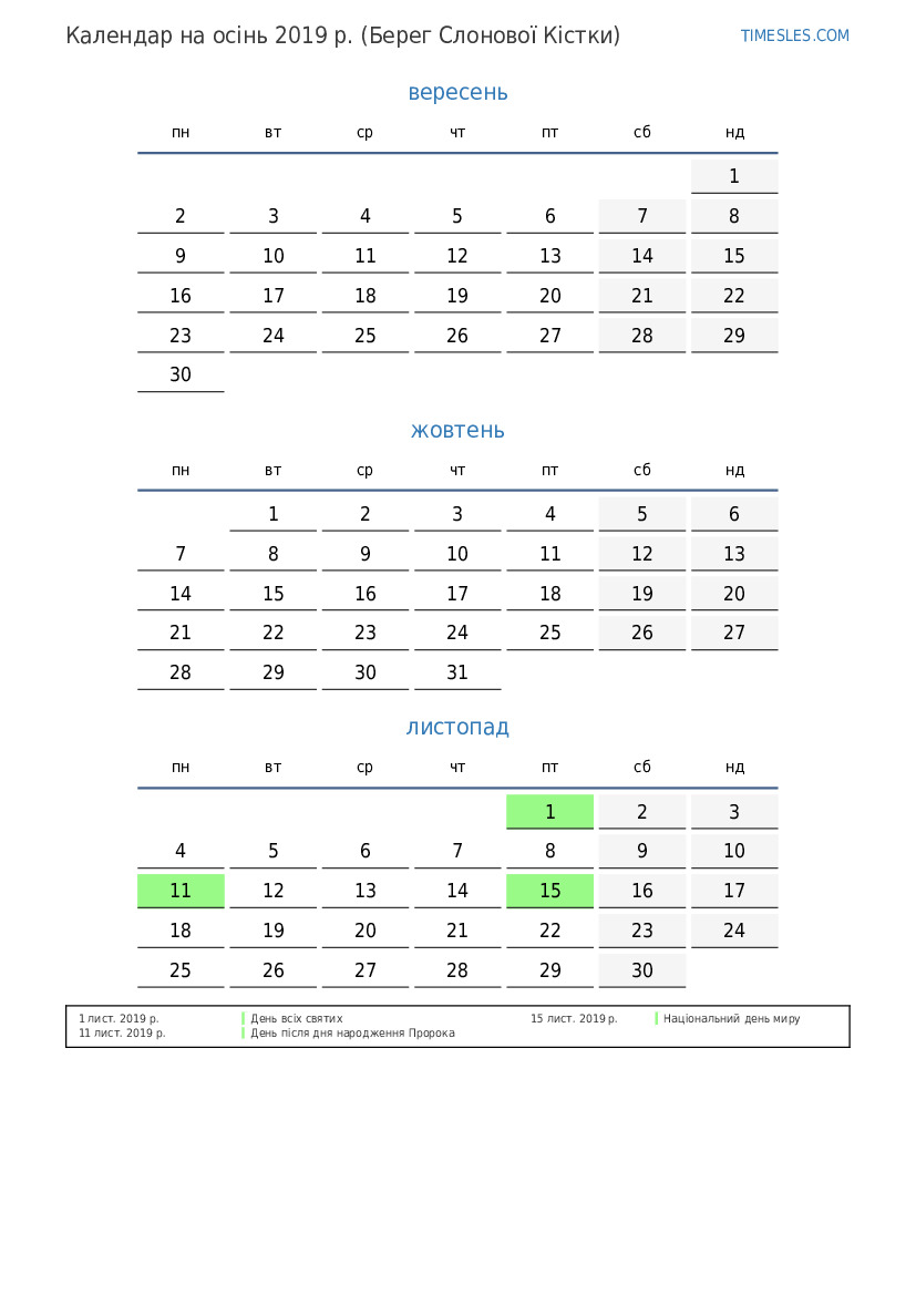 Завантажте та роздрукуйте календар PDF зі святами та вихідними на осінь 2019 року для Кот-д'Івуару
