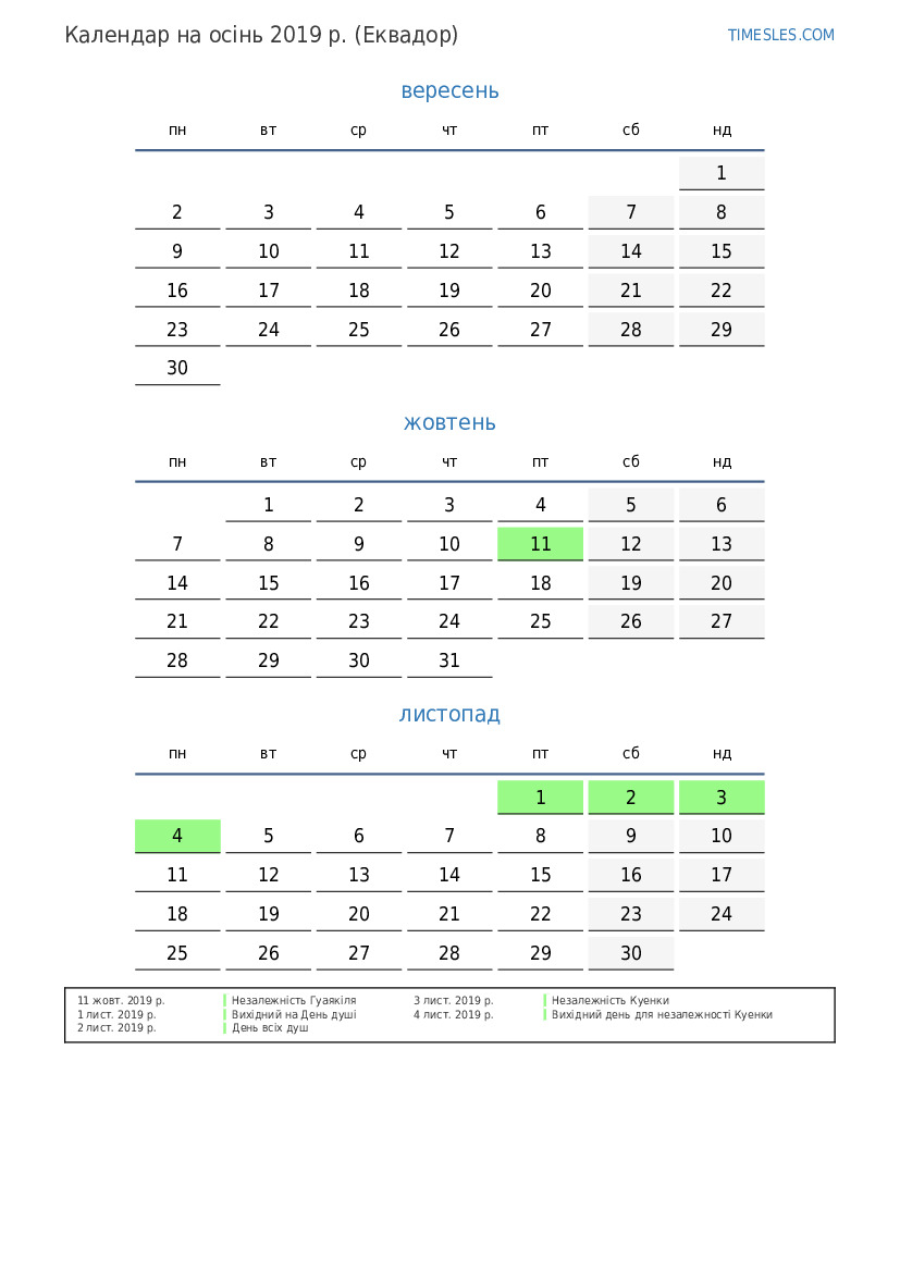 Завантажте та роздрукуйте календар PDF зі святами та вихідними на осінь 2019 року для Еквадору