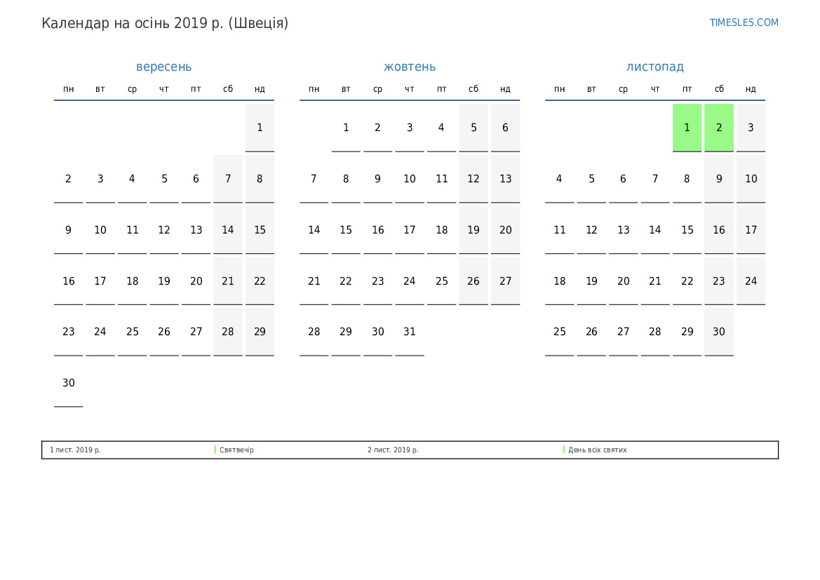 Завантажте та роздрукуйте календар PDF зі святами та вихідними на осінь 2019 року для Швеції