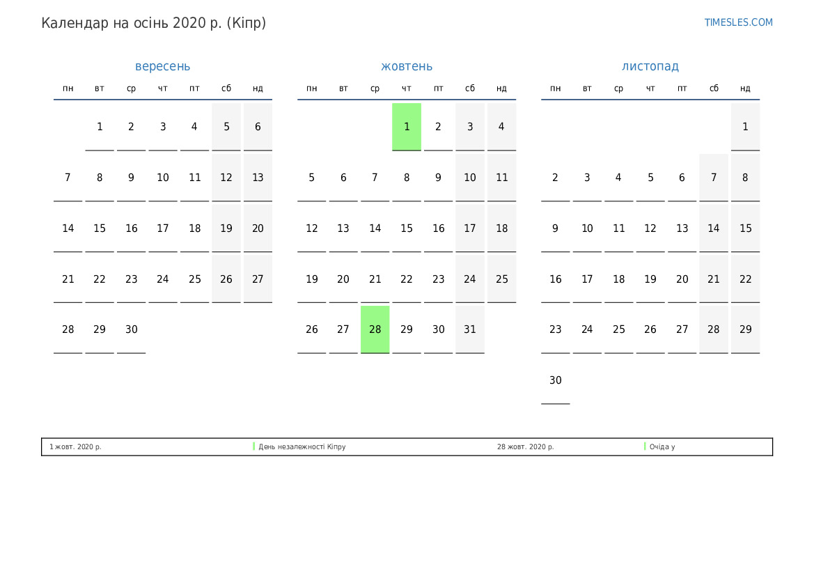 Завантажте та роздрукуйте календар PDF зі святами та вихідними на осінь 2020 року для Кіпру