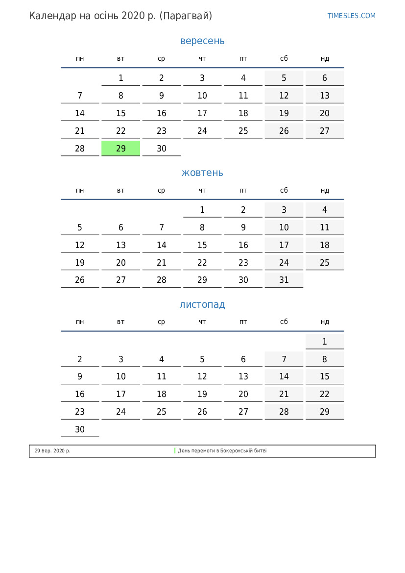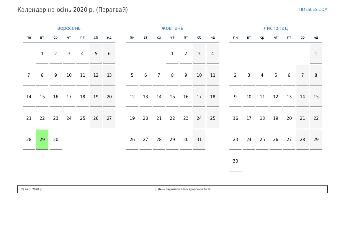 Завантажте та роздрукуйте календар PDF зі святами та вихідними на осінь 2020 року для Парагваю