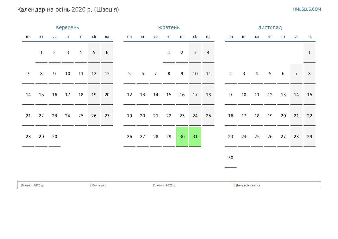 Завантажте та роздрукуйте календар PDF зі святами та вихідними на осінь 2020 року для Швеції