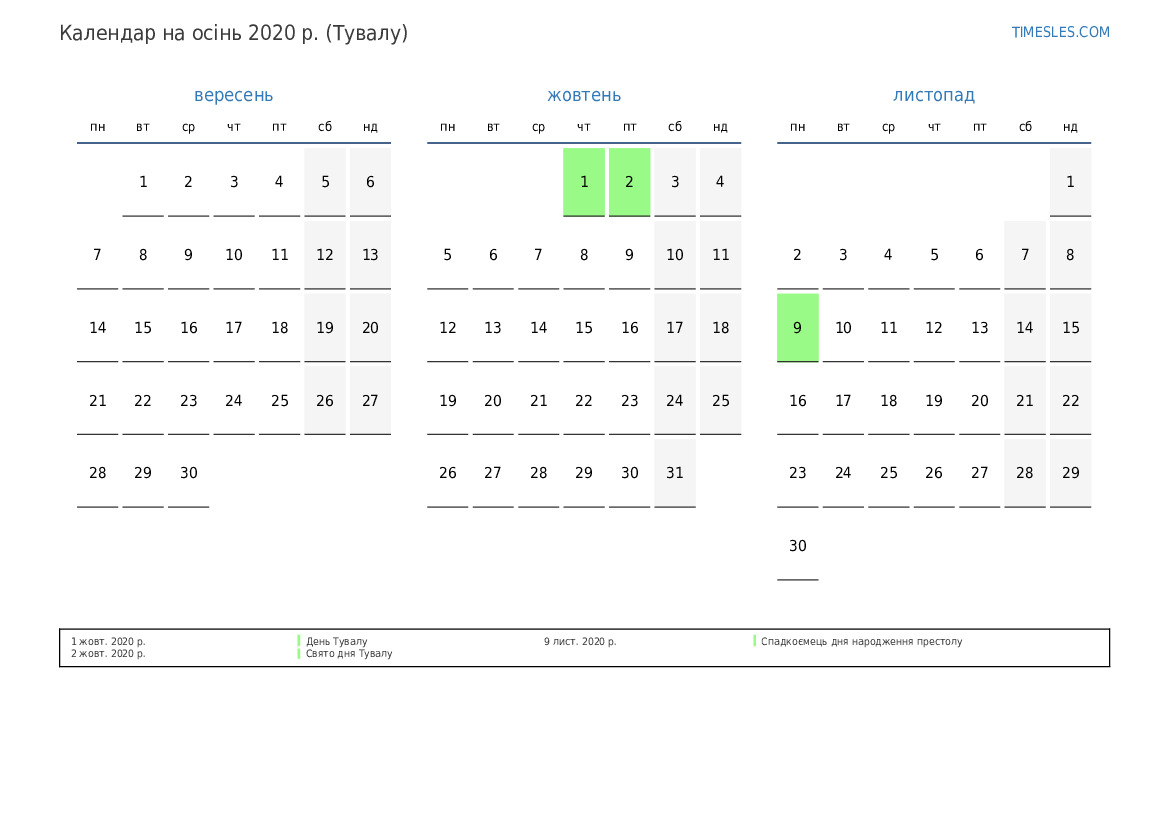 Завантажте та роздрукуйте календар PDF зі святами та вихідними на осінь 2020 року для Тувалу