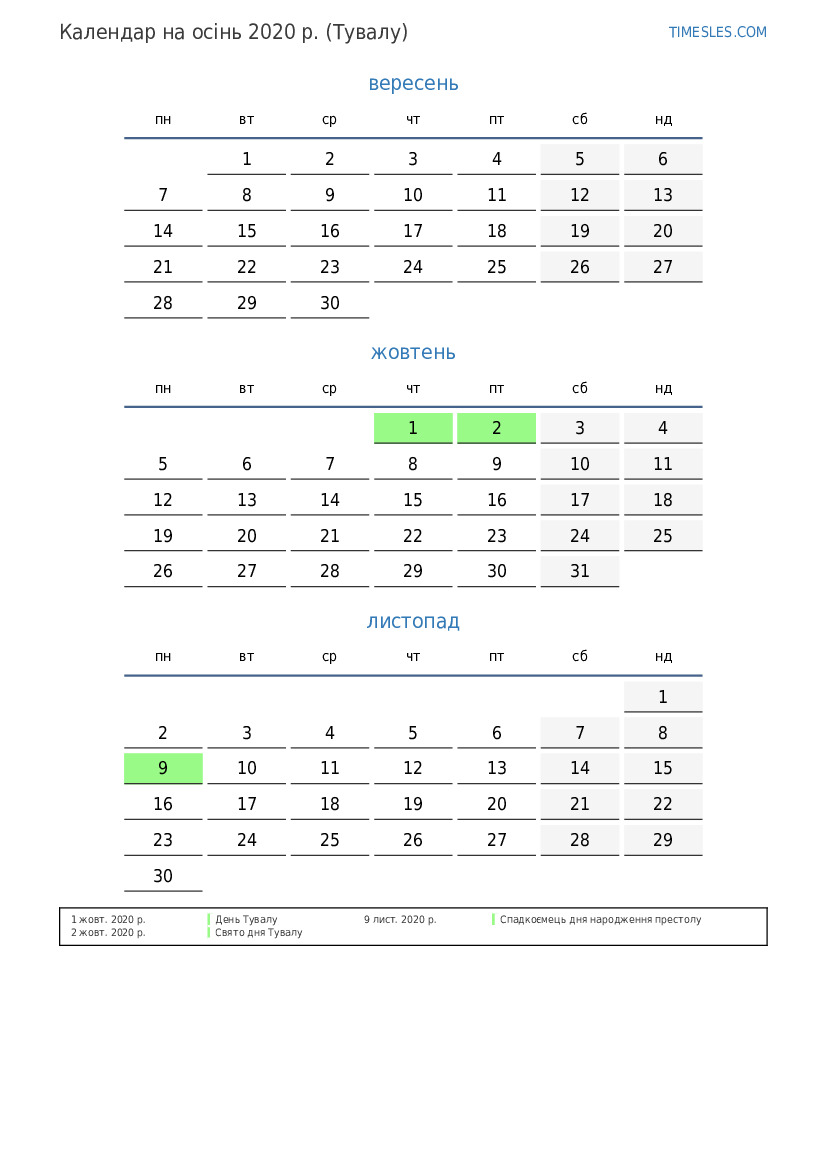 Календар свят і вихідних на осінь 2020 року для Тувалу
