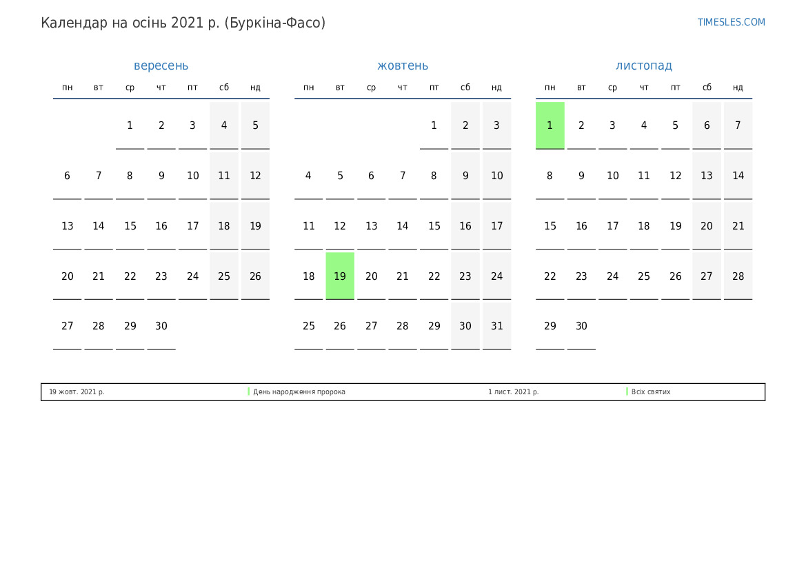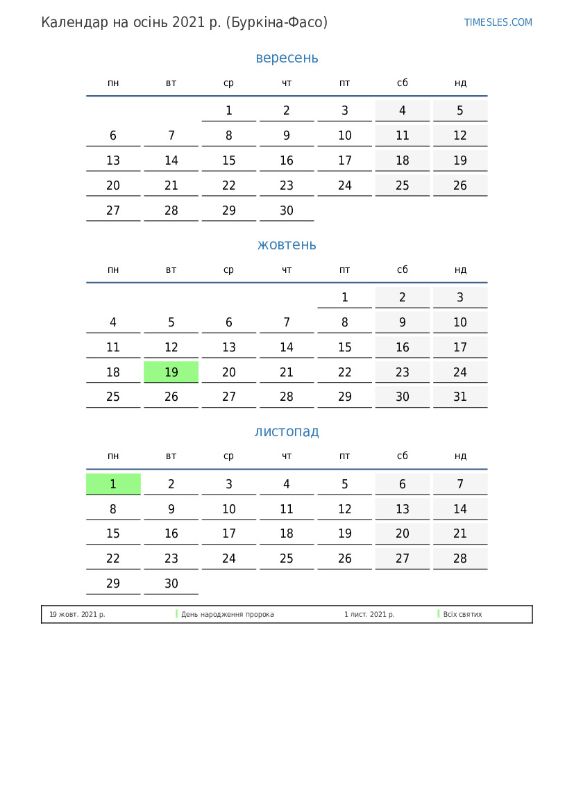 Завантажте та роздрукуйте календар PDF зі святами та вихідними на осінь 2021 року для Буркіна-Фасо