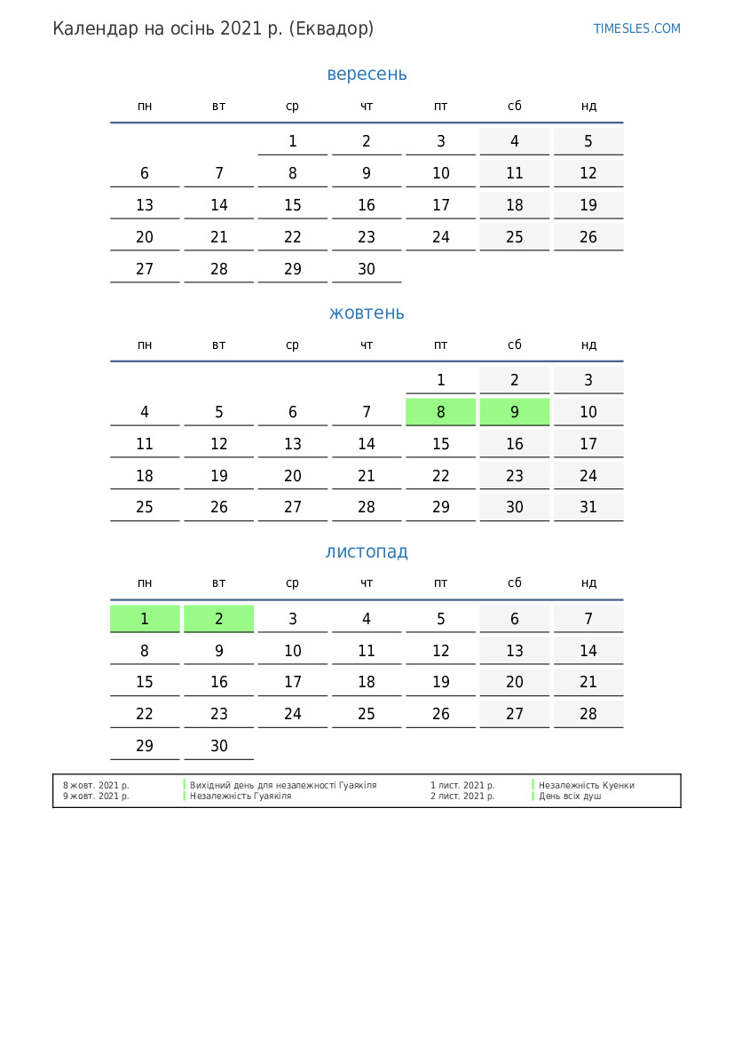 Завантажте та роздрукуйте календар PDF зі святами та вихідними на осінь 2021 року для Еквадору