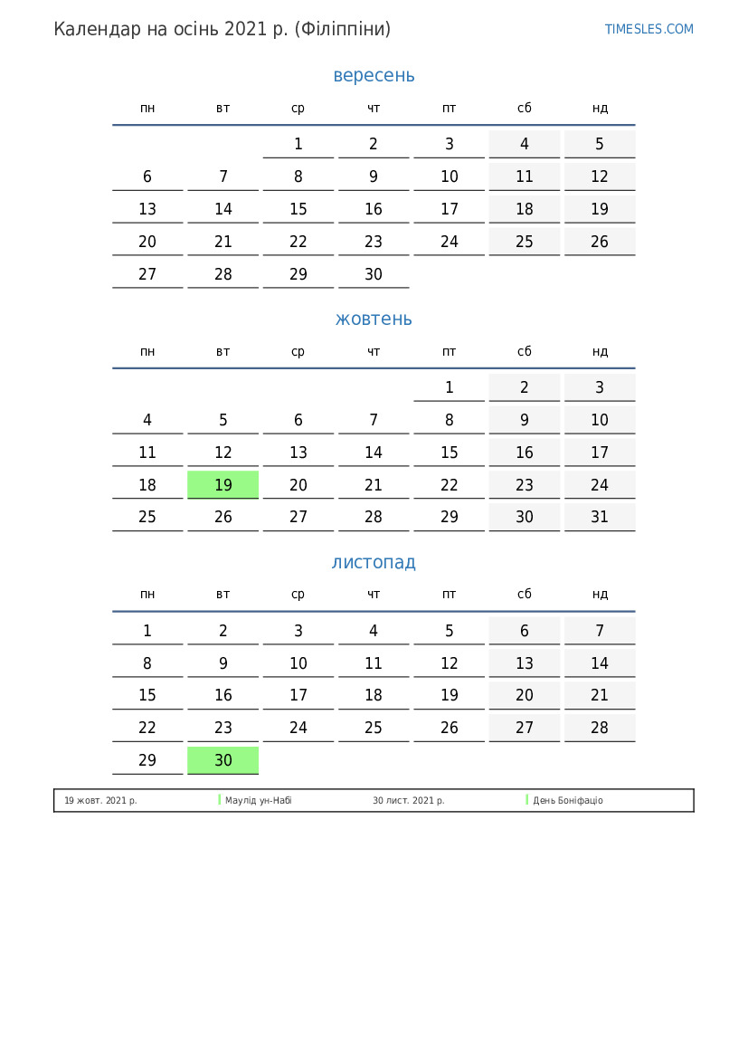 Завантажте та роздрукуйте календар PDF зі святами та вихідними на осінь 2021 року для Філіппін