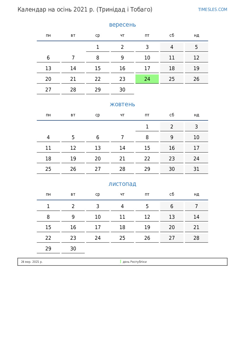 Календар на осінь 2021 року для Тринідаду та Тобаго