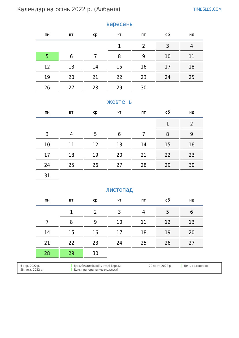 Завантажте та роздрукуйте календар PDF зі святами та вихідними на осінь 2022 року для Албанії