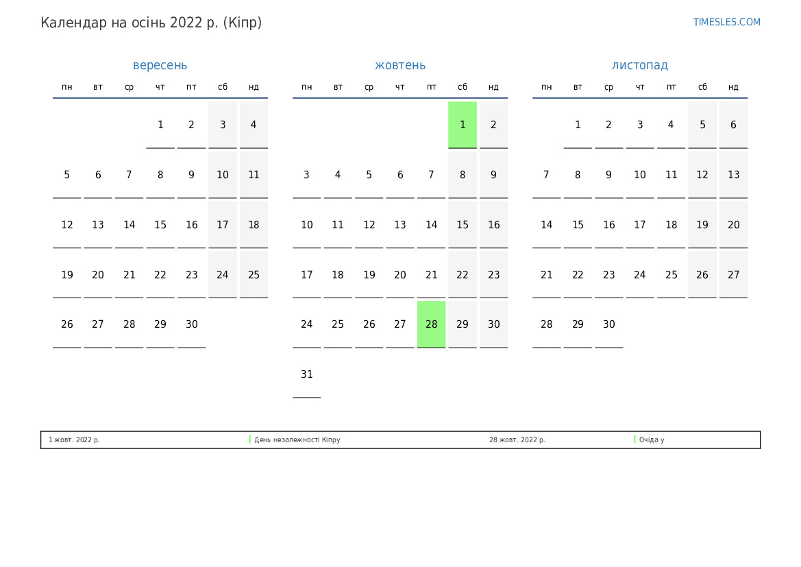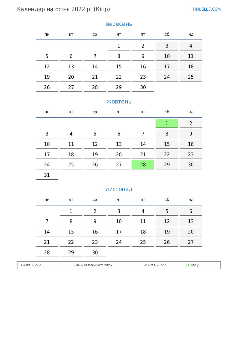Календар свят і вихідних на осінь 2022 року для Кіпру