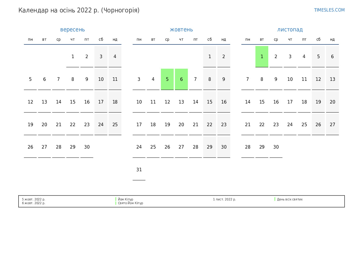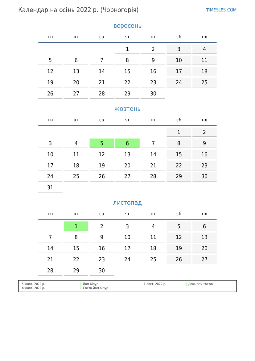 Завантажте та роздрукуйте календар PDF зі святами та вихідними на осінь 2022 року для Чорногорії