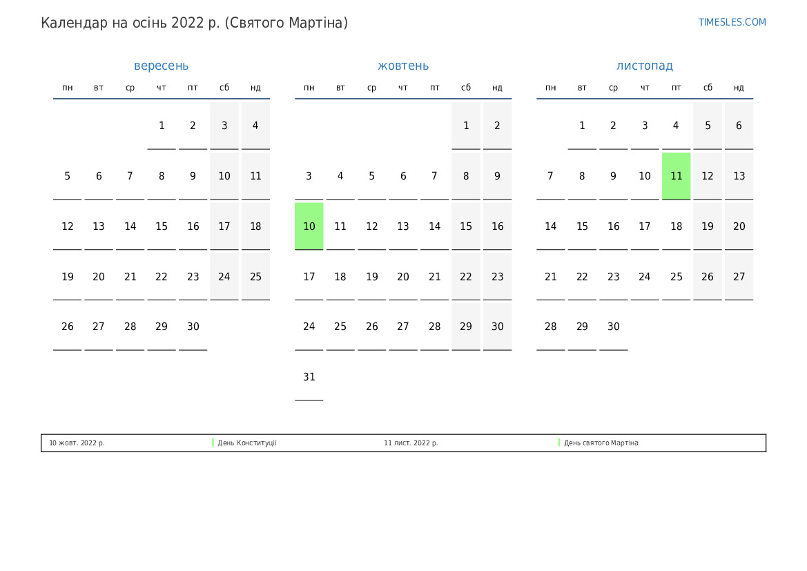 Восени 2022 року у Сінт-Мартені буває 3 свят та вихідні. Осінь 2022 року починається у четвер і закінчується в середу.