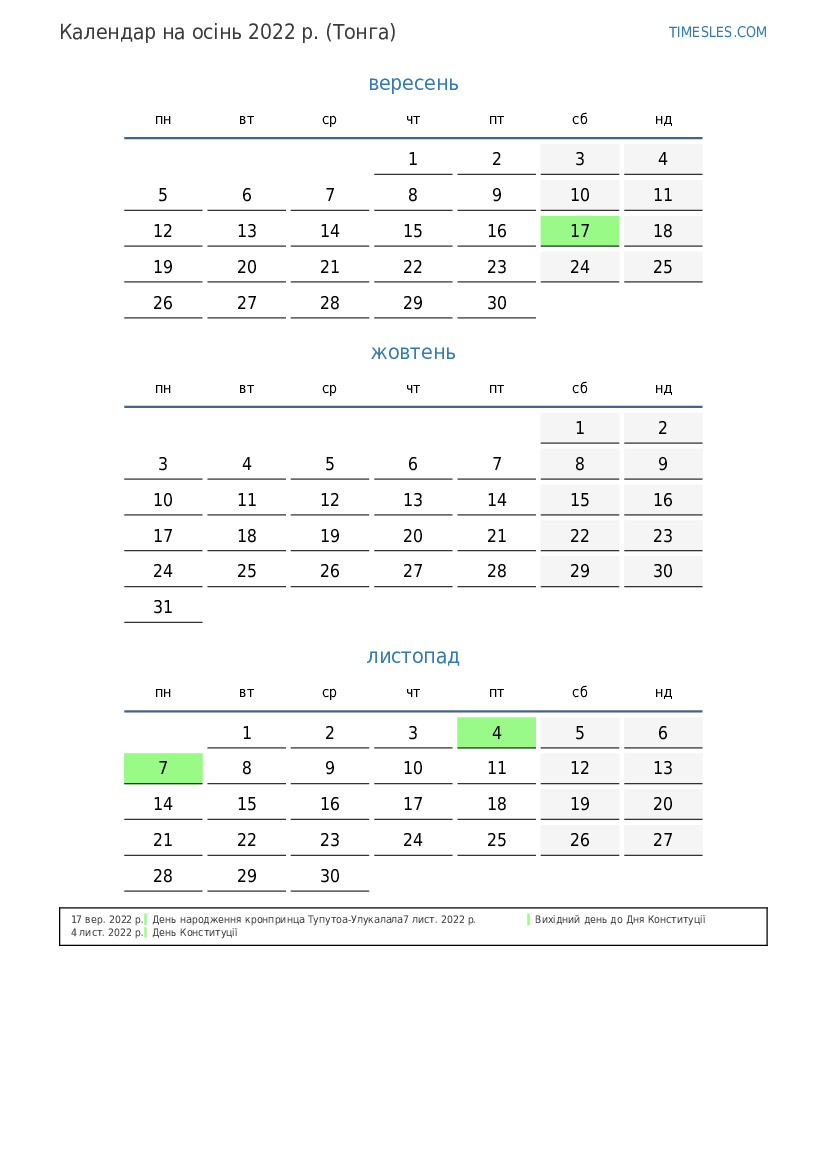Календар свят і вихідних на осінь 2022 року для Тонги