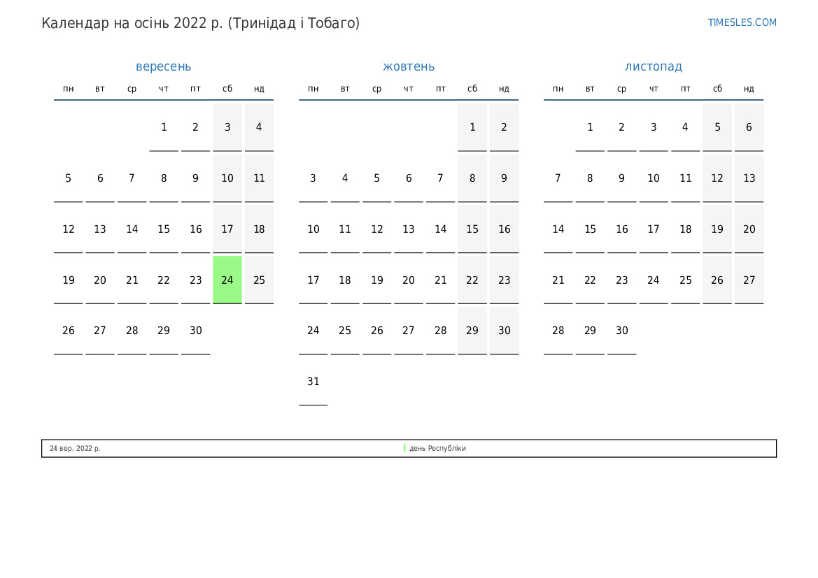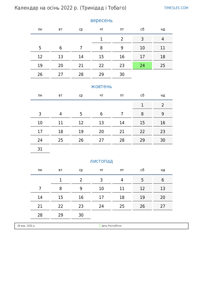 Календар на осінь 2022 року для Тринідаду та Тобаго